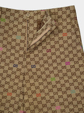 These camel and dark brown shorts feature Gucci's iconic GG canvas, showcasing timeless luxury with a modern twist. Crafted from durable cotton-blend canvas, they offer a structured silhouette with a relaxed fit. The signature monogram pattern is complemented by refined detailing, such as side pockets and an adjustable waistband. Ideal for warm-weather styling, these shorts effortlessly blend casual comfort with sophisticated branding.
