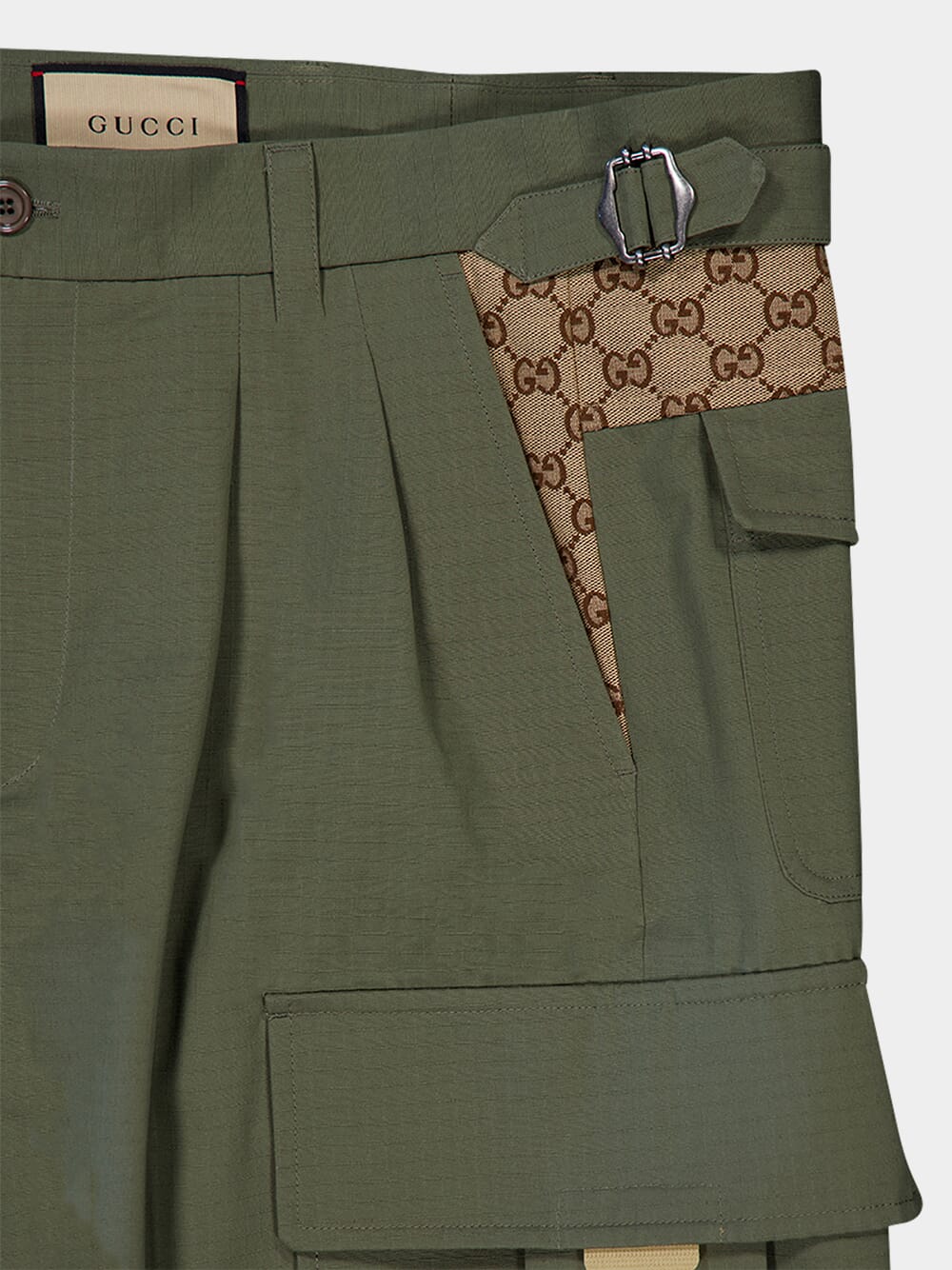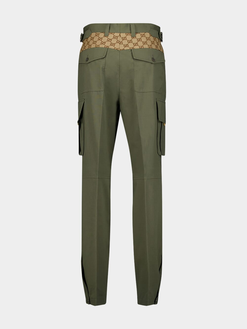 Cargo Trousers, featuring a luxurious Beige and Ebony GG canvas insert that exudes sophistication. Crafted with precision, these trousers come with convenient belt loops and metal buckles on the back waistband for a custom fit. Embrace the practicality of front slash pockets and side pockets with velcro closure, perfect for carrying your essentials. The back flap pockets with buttons add a touch of elegance to the design. Complete with buttons at the cuffs and a button and zip closure, these cargo trousers offer both style and ease of wear.