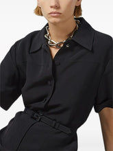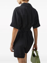 This luxurious black short jumpsuit in viscose crêpe cady is a testament to modern elegance. Featuring a sleek spread collar and a waist-cinching belt, it offers both comfort and style. The tailored fit and sophisticated silhouette make it an ideal choice for upscale social events or professional settings.