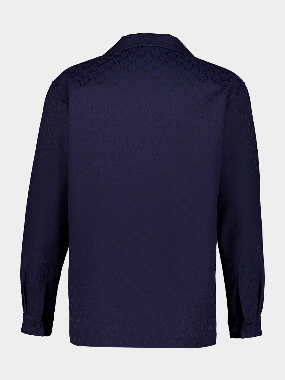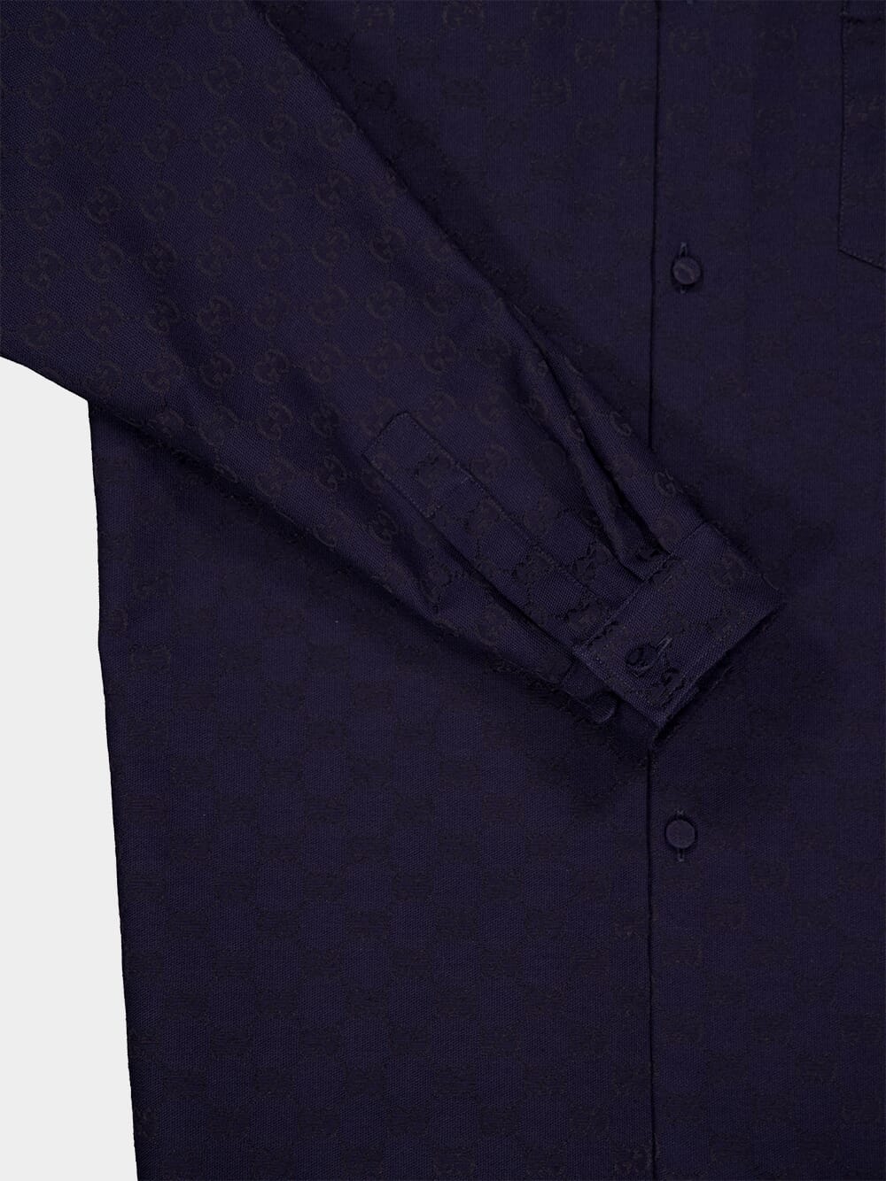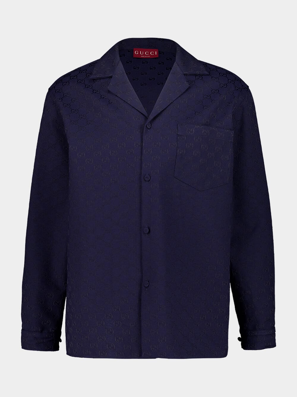 The Dark Blue GG Canvas Shirt showcases Gucci's signature GG motif, honoring the brand's heritage. Crafted from GG canvas, this regular fit shirt features an open collar, long sleeves, a chest pocket, and elegant side slits. Its relaxed silhouette and premium craftsmanship make it a versatile addition to any wardrobe. Made in Italy, it is perfect for both casual and elevated styling.