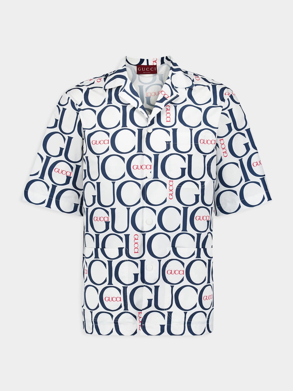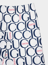 Step into a stylish summer with these Maxi Gucci Print Fabric Shorts from the Gucci Lido collection. Showcasing a bold allover Gucci print in white and blue, these shorts are designed for comfort and style with an elastic waist with drawstring and multiple pockets for functionality.