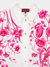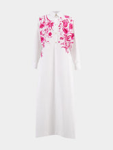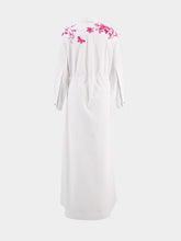 Inspired by the summer spirit and beach clubs on the Italian coast, this white floral maxi cotton dress is part of the Gucci Lido collection. Crafted from premium cotton, the dress features vibrant fuchsia floral embroidery on the front and back yoke. With long sleeves and a button-down front, it combines elegance with comfort. Perfect for warm-weather occasions, this dress adds a touch of sophistication to any summer wardrobe.