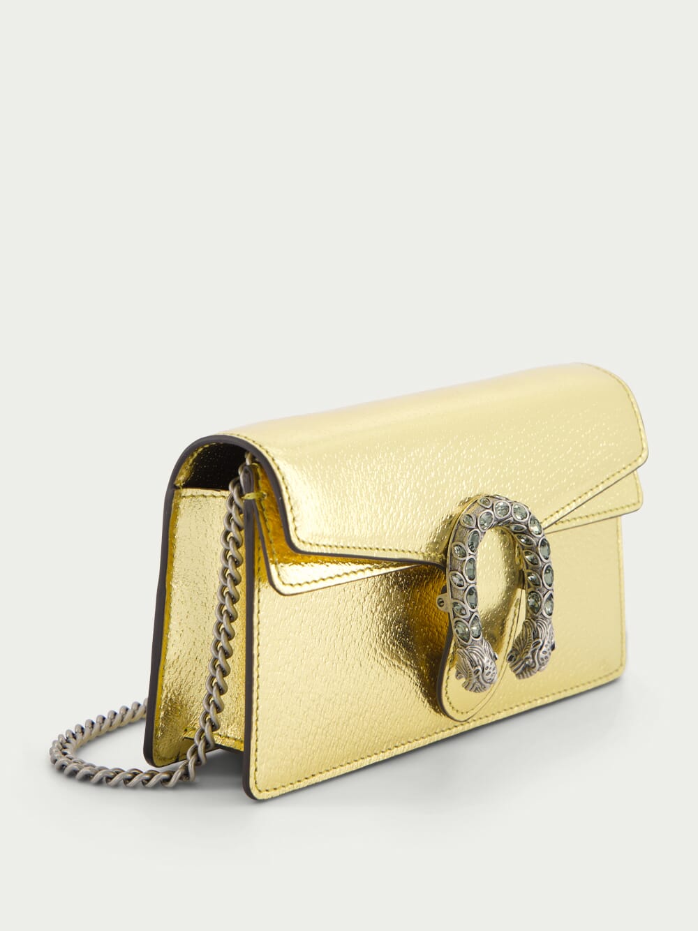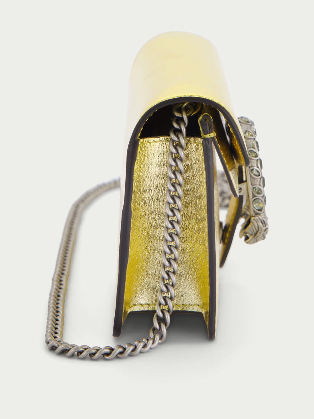 Gucci metallic gold leather super mini Dionysus bag with metal textured tiger head and sparkling Swarovski crystals closure.