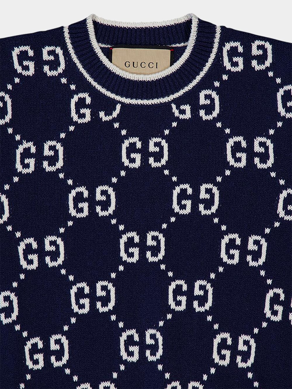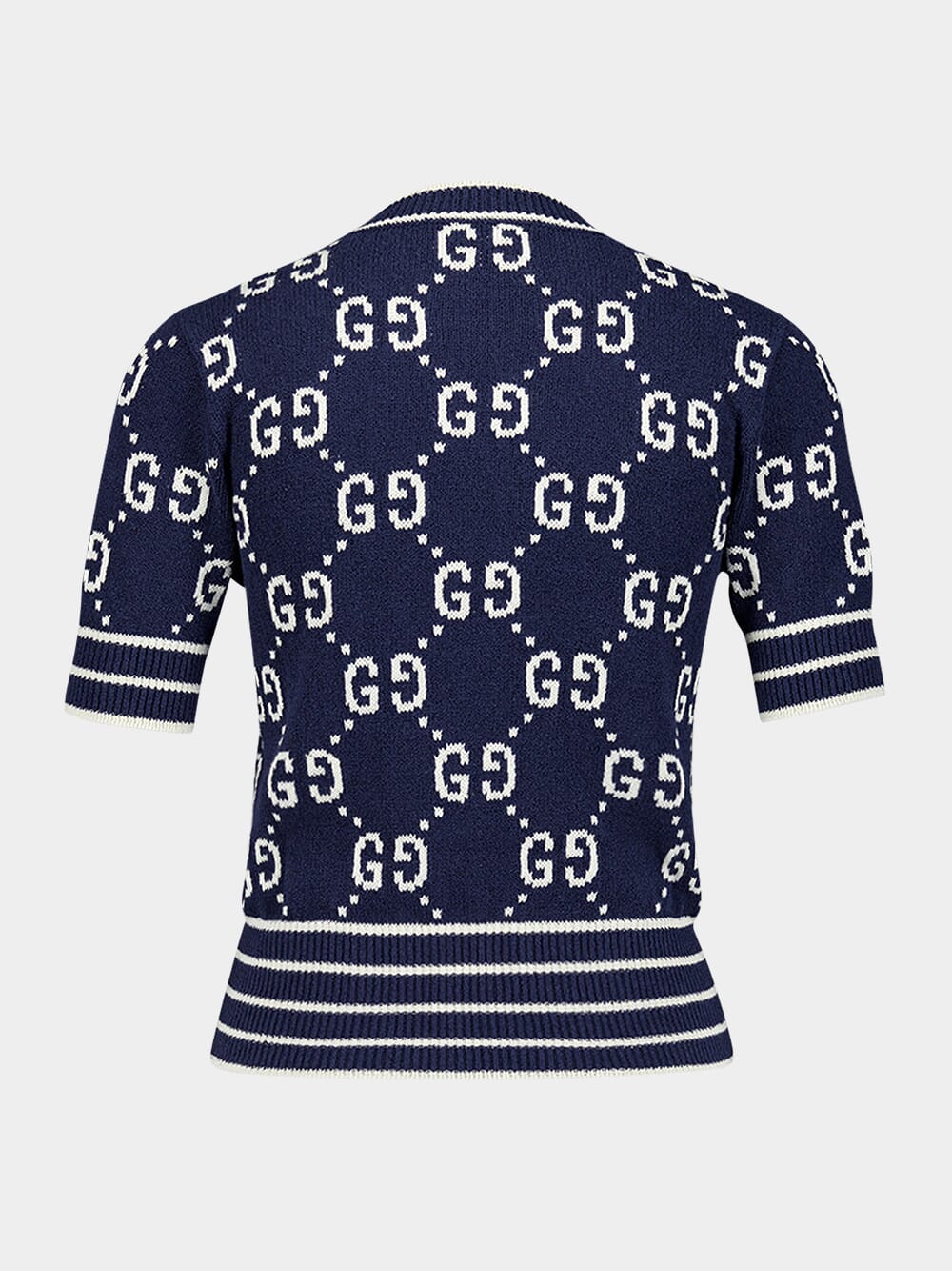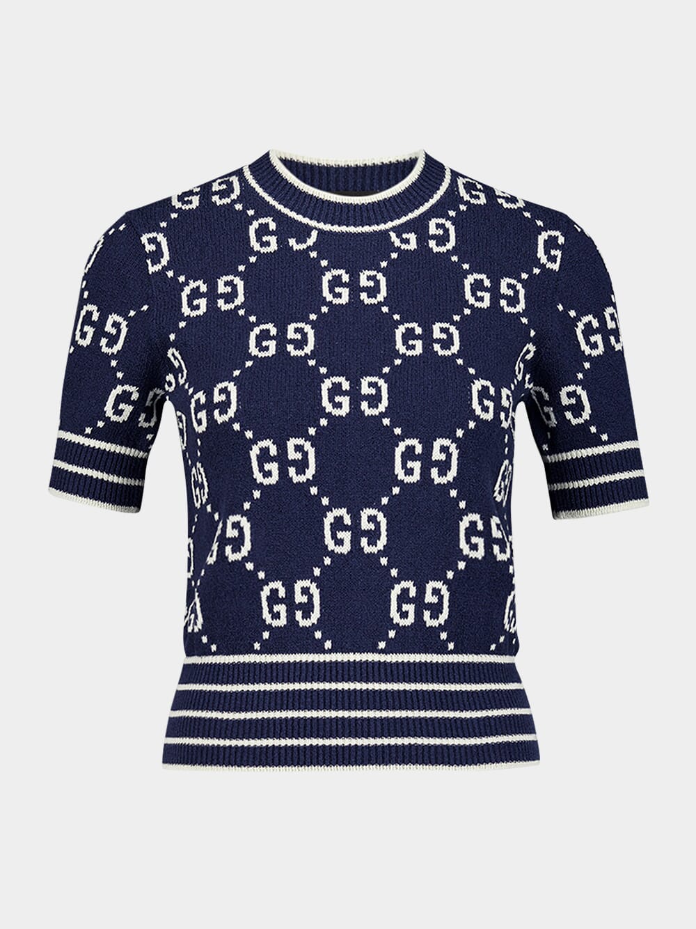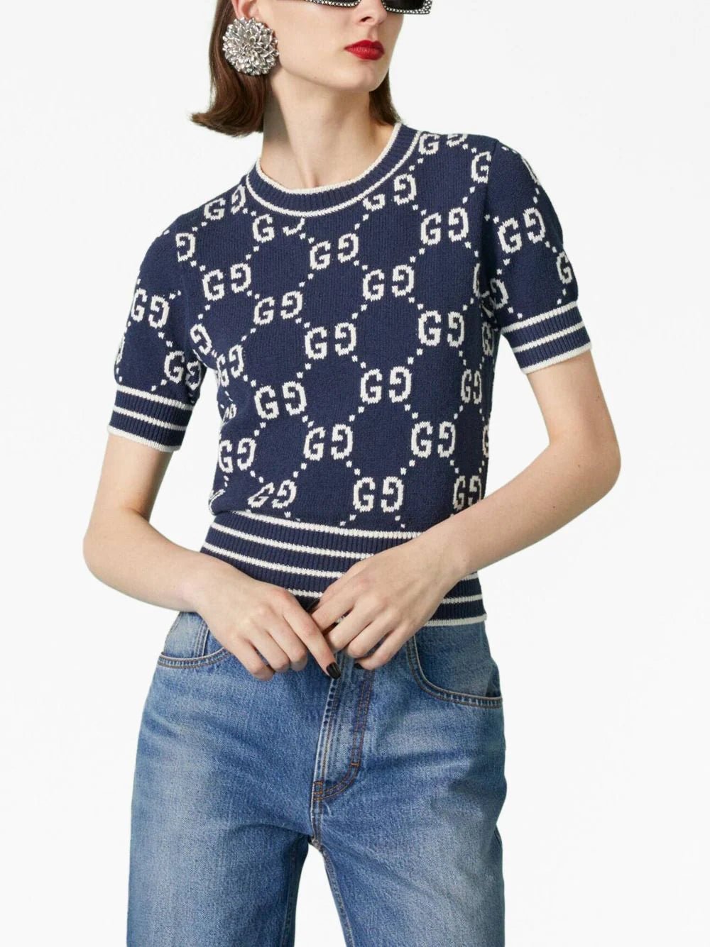 Double G Logo Jacquard Top, meticulously crafted with a knitted construction for unparalleled comfort. Embrace sophistication with the monogram jacquard pattern that exudes contemporary charm. Featuring a classic crew neck and short sleeves, this top offers both style and versatility. The striped edge adds a trendy touch, while the ribbed hem ensures a flattering fit.