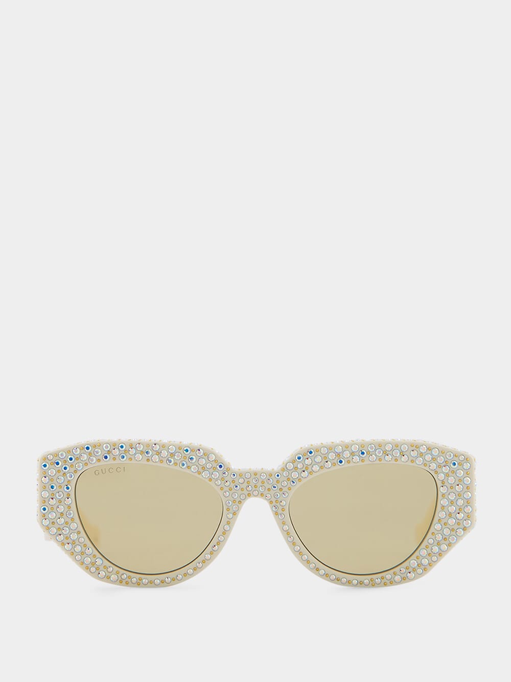 Geometric-Frame Sunglasses, featuring an acetate frame adorned with crystals and the iconic Double G logo for a touch of opulence. Elevate your look with the captivating geometric frame and solid light brown lens, while UV-protective technology ensures comprehensive eye care. Embrace both comfort and elegance with sculpted arms and curved tips, ensuring a secure and snug fit.