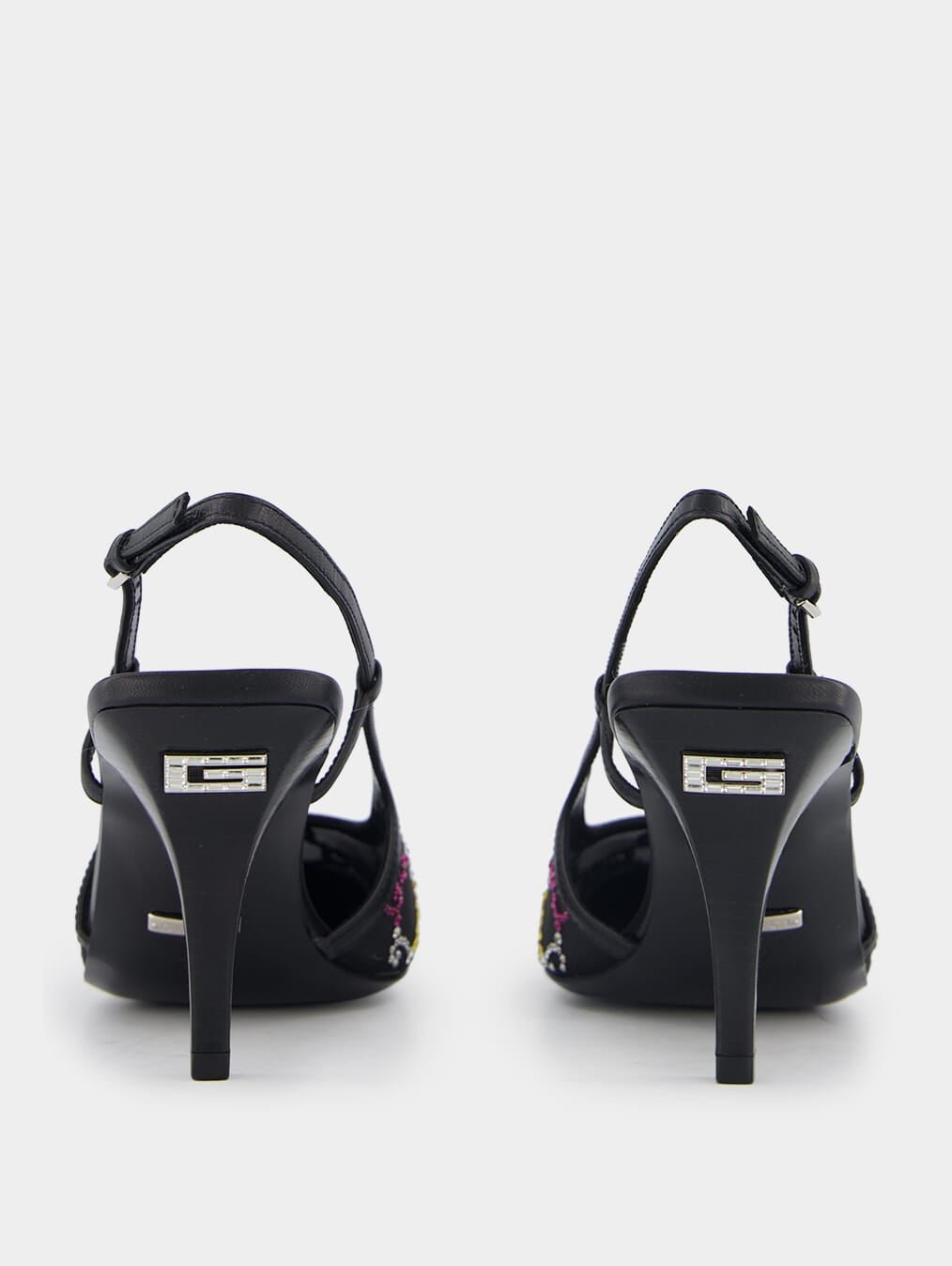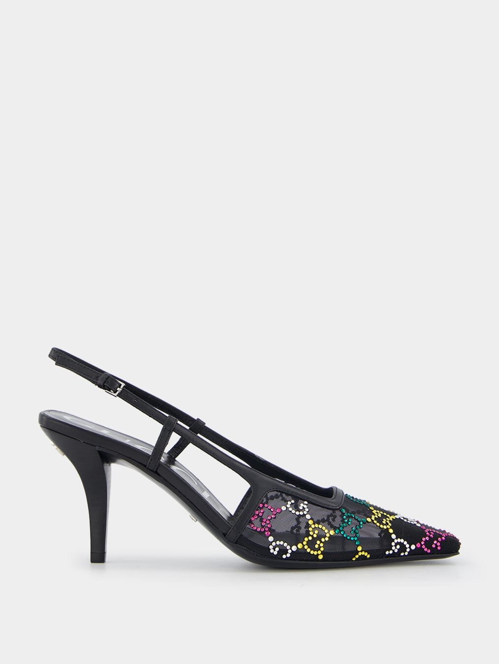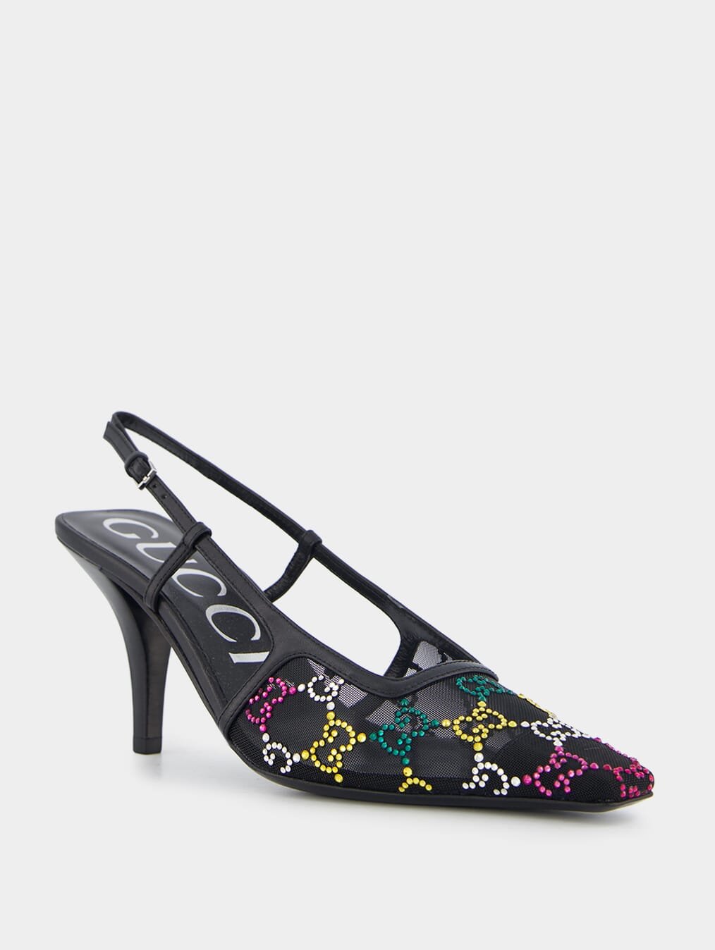 GG Crystal-Embellished Mesh 75mm Pumps. These pumps blend elegance and contemporary style with exquisite mesh detailing and leather trim. The signature Double G logo and dazzling glass crystal embellishment add a touch of opulence to your ensemble. With a pointed toe and buckle-fastening slingback strap for a secure fit, these pumps offer both comfort and sophistication.