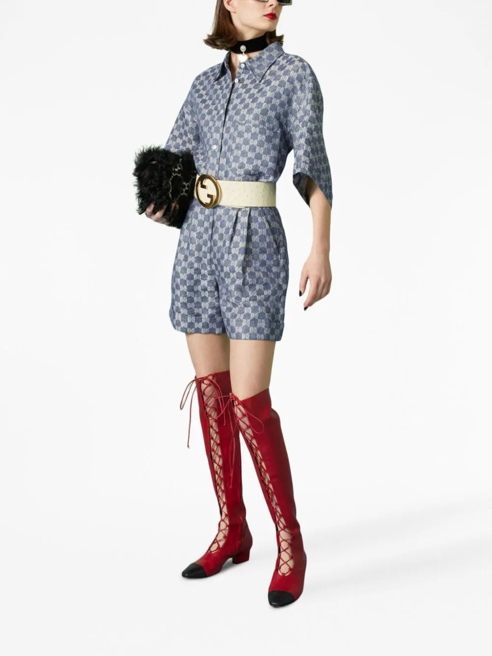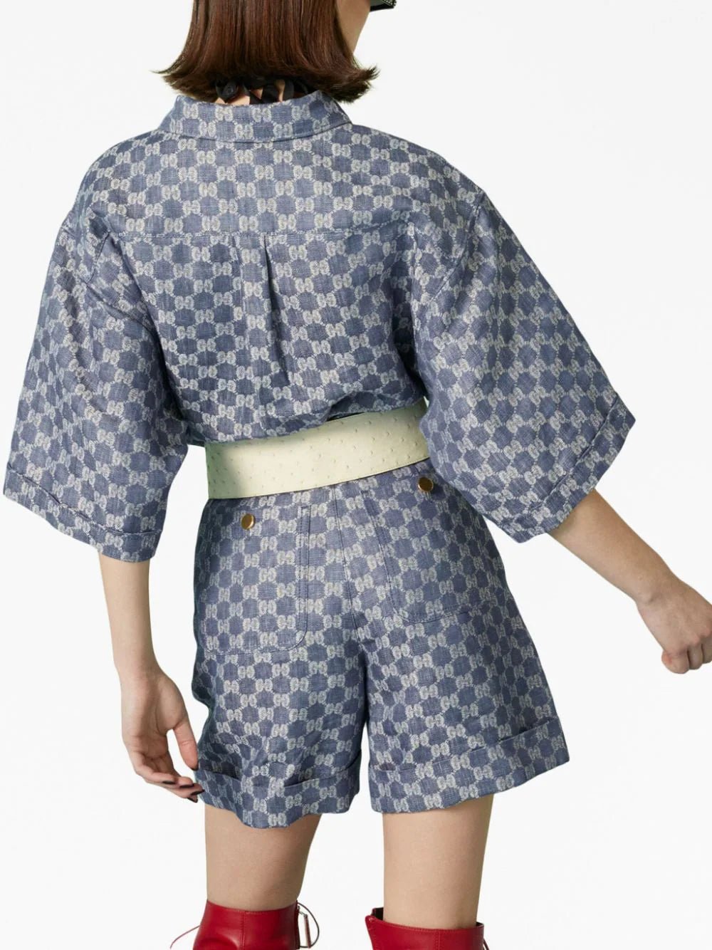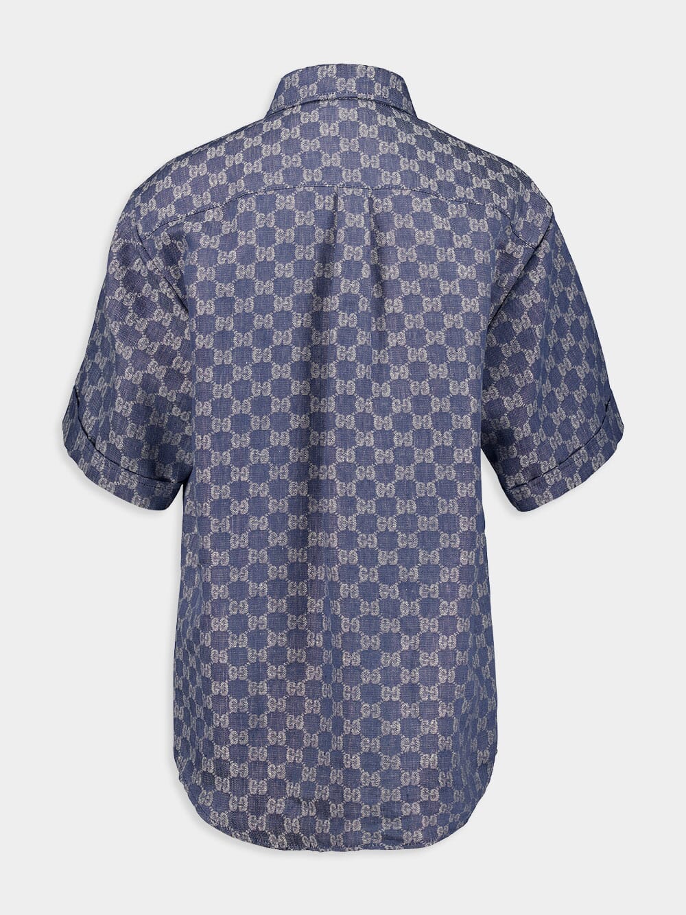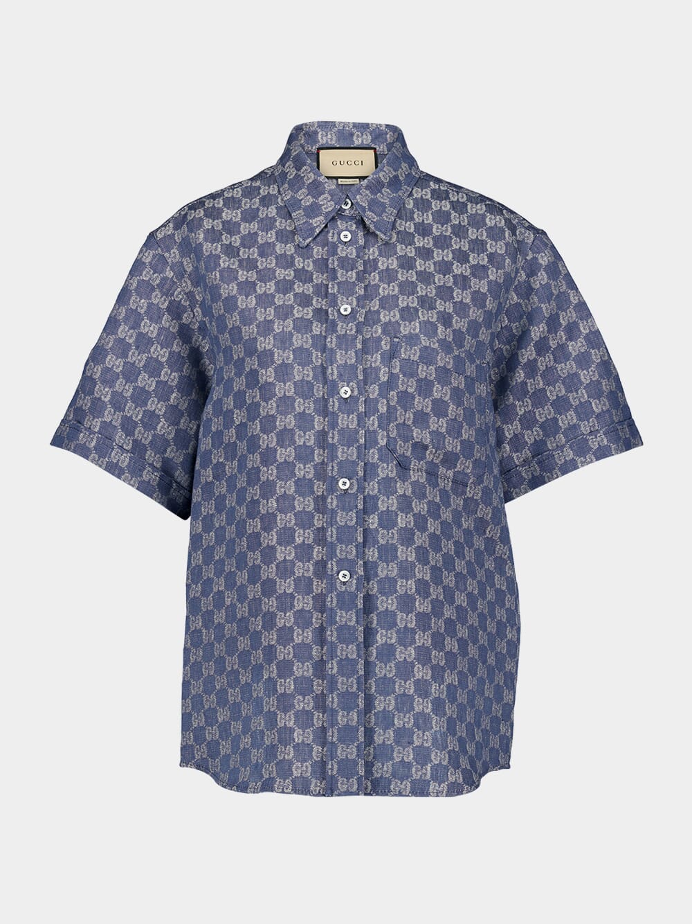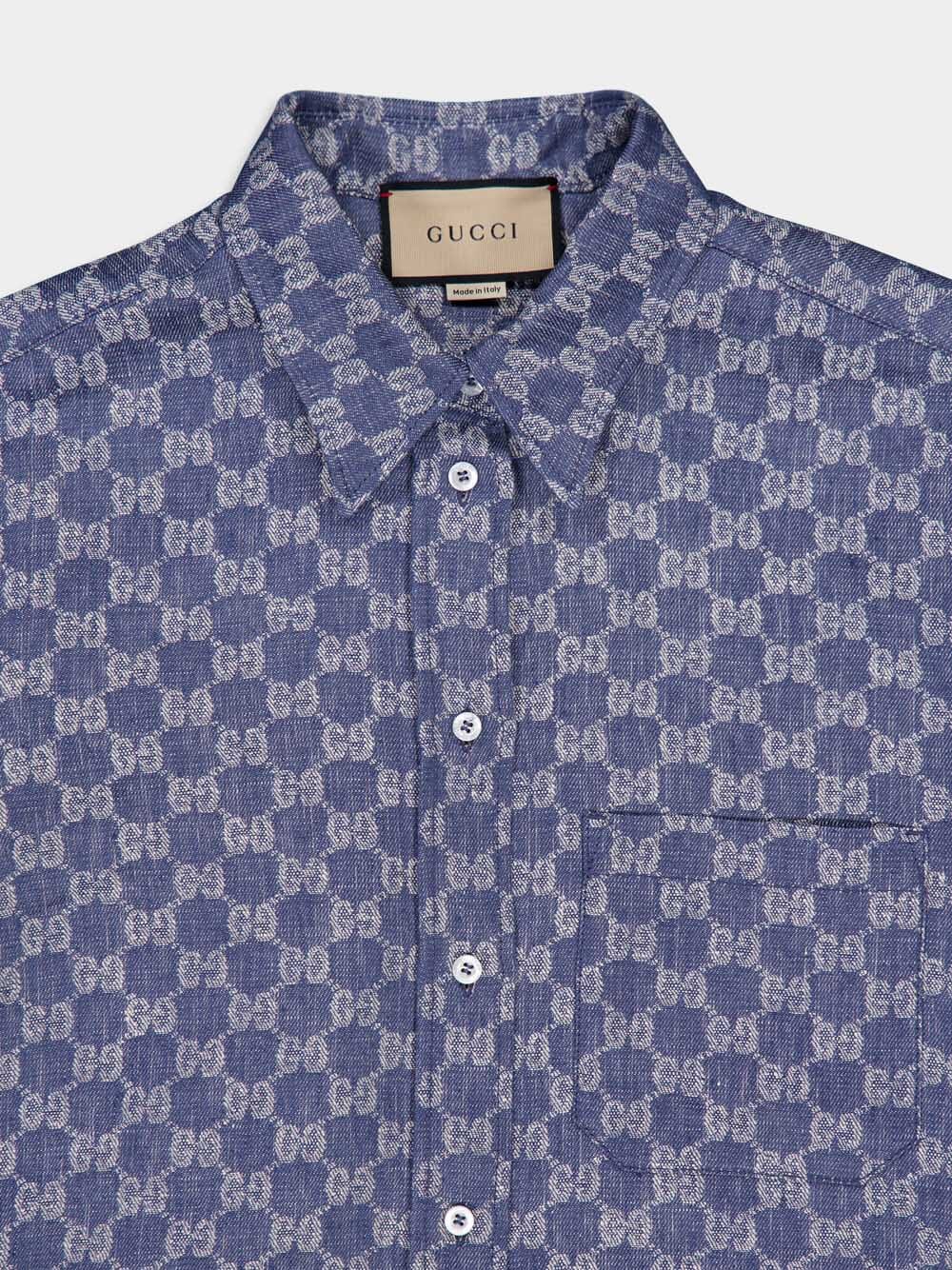 GG Linen Jacquard Shirt, expertly crafted from the finest linen/flax blend. This shirt features an intricate jacquard G monogram motif, adding a touch of luxury to your ensemble. The classic collar and front button fastening exude timeless sophistication, while the chest patch pocket combines style and functionality. With short sleeves and a high-low hem, this shirt offers both comfort and modern flair.