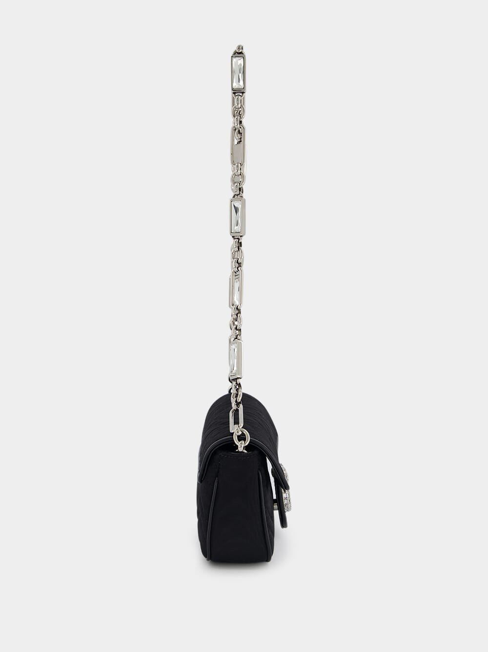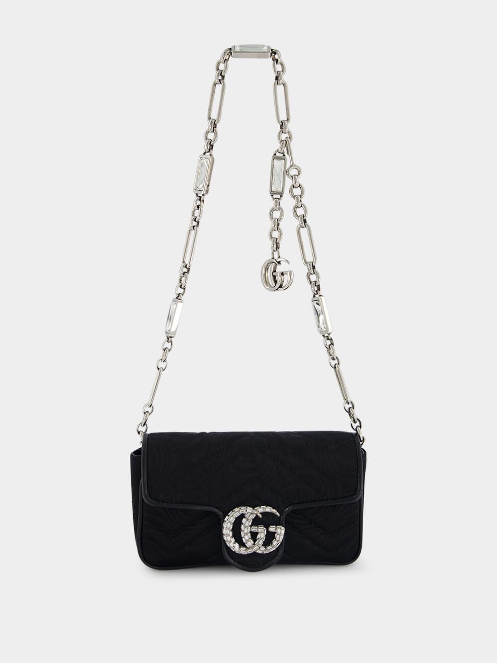 GG Marmont Crystal-Embellished Belt Bag, featuring the signature Marmont quilting, this bag showcases a timeless and elegant design. Adorned with palladium-tone hardware, it exudes a sense of opulence and sophistication. The signature Double G logo adds a touch of iconic style, while the crystal embellishments elevate the bag's glamour quotient. The foldover top with magnetic fastening ensures easy access and secure closure. The adjustable chain-link shoulder strap offers versatility and comfort, allowing you to wear it effortlessly. Inside, you'll find a spacious main compartment, providing ample space for your belongings.