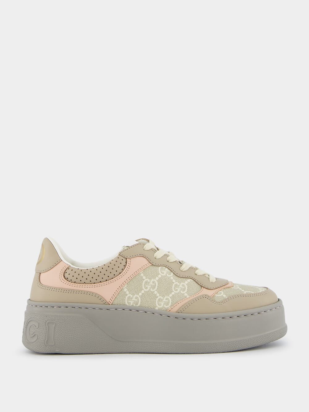 GG Panelled Low-Top Sneakers, crafted with classic GG canvas and leather trim, these sneakers showcase a chic and timeless design. The panelled design and round toe add a touch of sophistication. Enjoy a secure fit with the front lace-up fastening and experience added height with the platform sole. Women's Gucci sneakers fit large, so for the most comfortable fit, we recommend selecting half a size down.