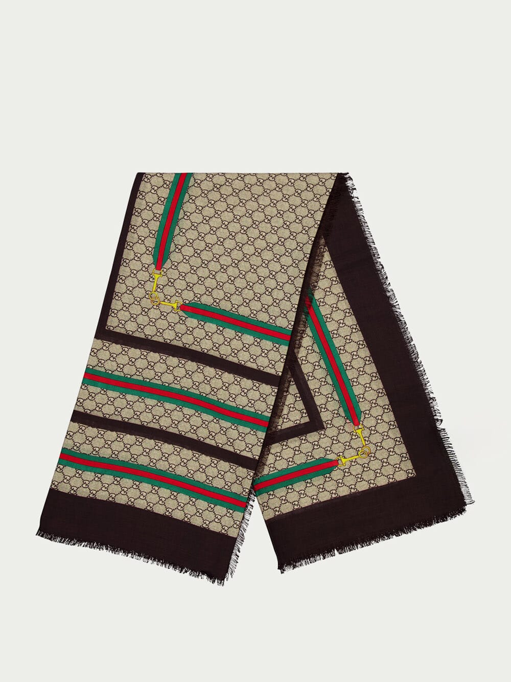 GG Silk Wool Shawl, crafted with the finest beige and ebony GG silk wool, this shawl exudes elegance and sophistication. The brown trim adds a refined touch, enhancing the overall aesthetic appeal. Adorned with the iconic green and red Web Horsebit geometric print, this shawl showcases a harmonious blend of classic and contemporary design elements.