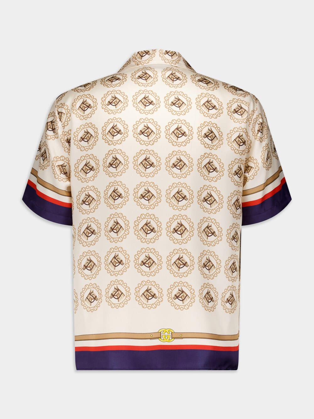 Graphic-Print Silk Shirt, with its mesmerizing all-over graphic print and stylish stripe detailing, it effortlessly combines artistry and fashion. The notched collar adds a touch of sophistication, while the front button fastening allows for easy wearability. Designed with a straight hem, this shirt offers a versatile and flattering fit.