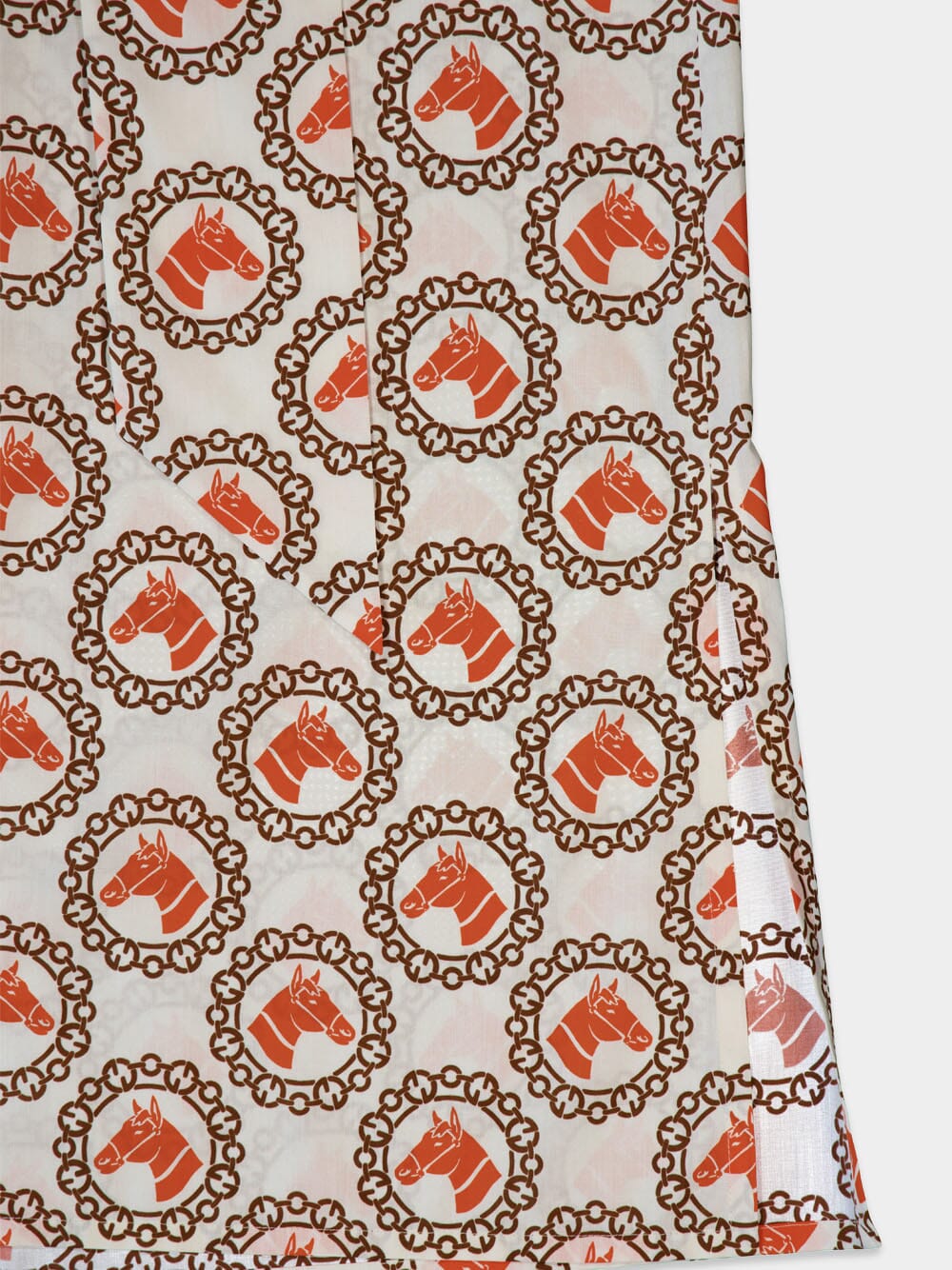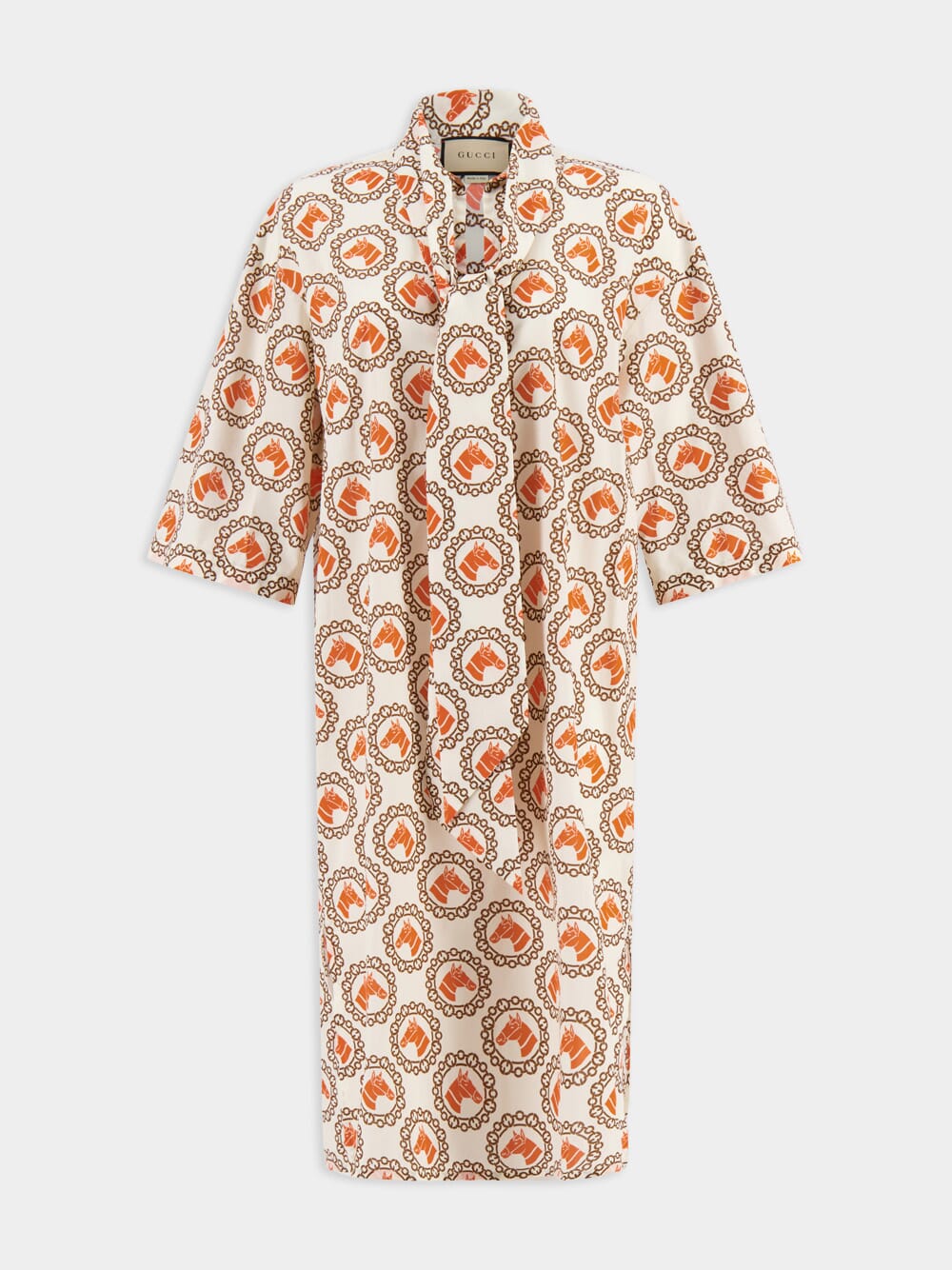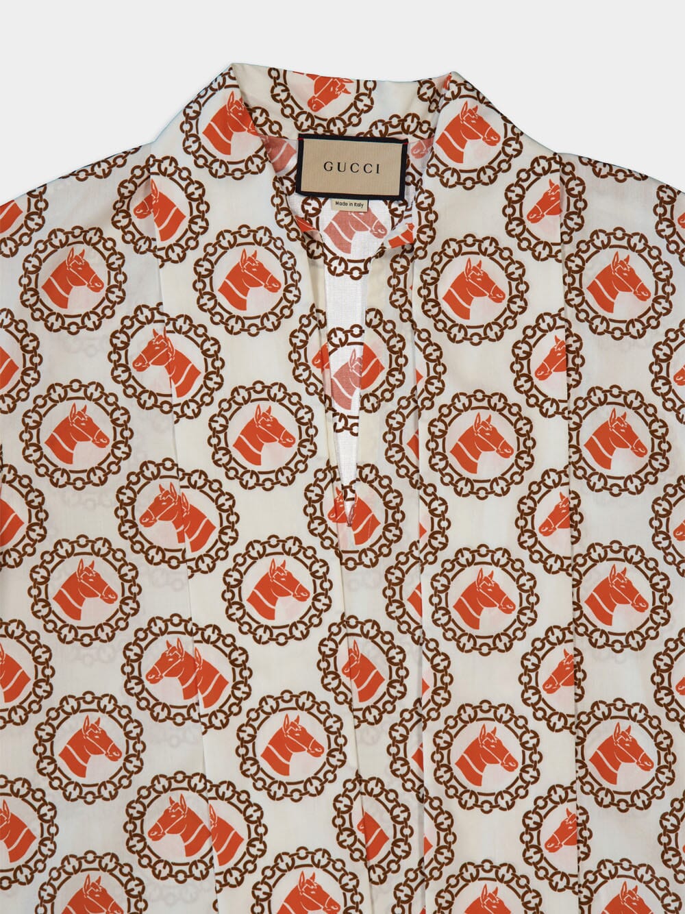 Horse-Print Cotton-Muslin Kaftan, a stunning and unique garment that pays homage to Gucci's rich equestrian heritage. Equestrianism is deeply ingrained in Gucci’s history, and this kaftan beautifully illustrates this connection with its orange and brown horse and GG-chain print. Crafted from white cotton-muslin, it offers a lightweight and breathable feel, perfect for warm weather. The kaftan design provides a relaxed and effortless silhouette, ideal for casual or resort wear.