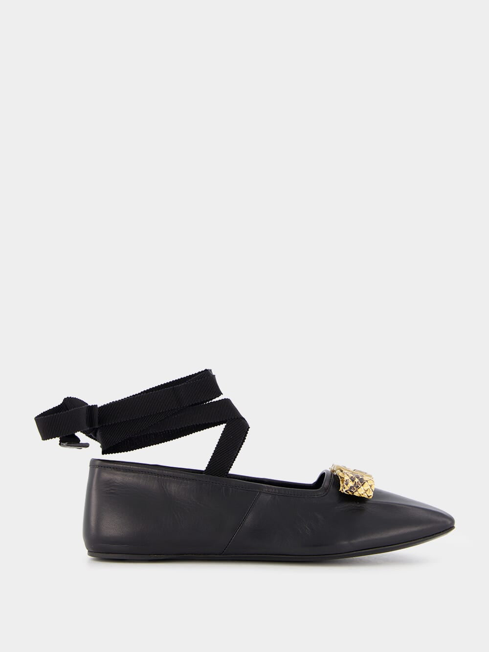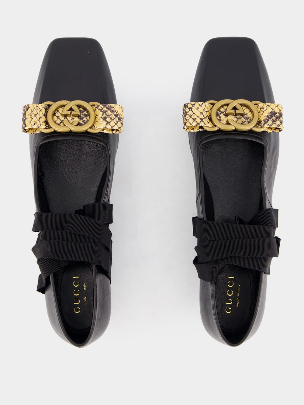 Crafted in Italy from the finest black calf leather, these ballet flats feature a signature Interlocking G logo plaque and delicate lace-up detailing. The square toe and gold-tone hardware add a touch of sophistication, while the branded leather insole and flat leather sole provide comfort and durability. Elevate your wardrobe with these exclusive flats.