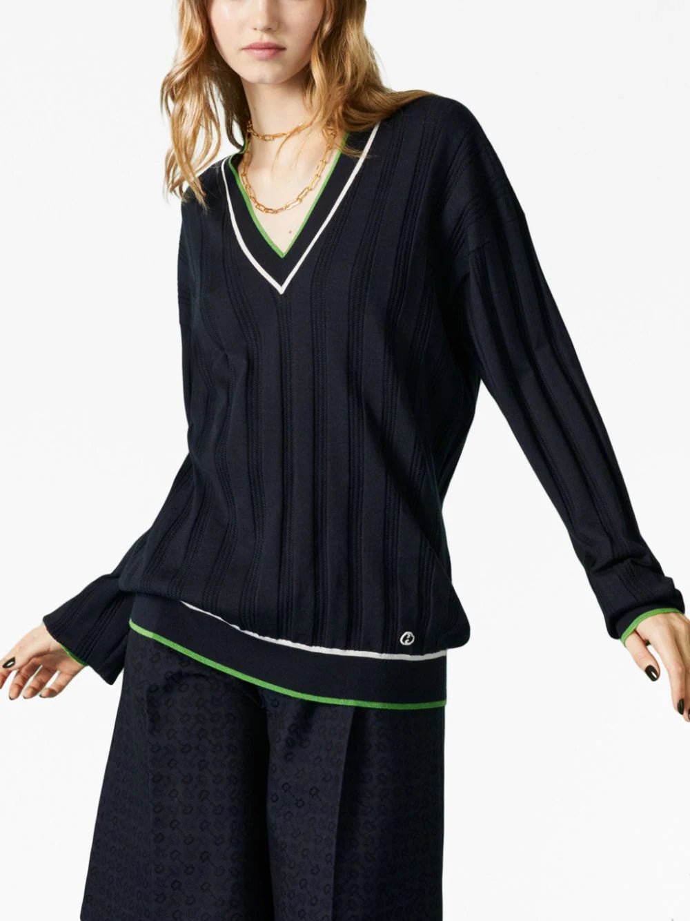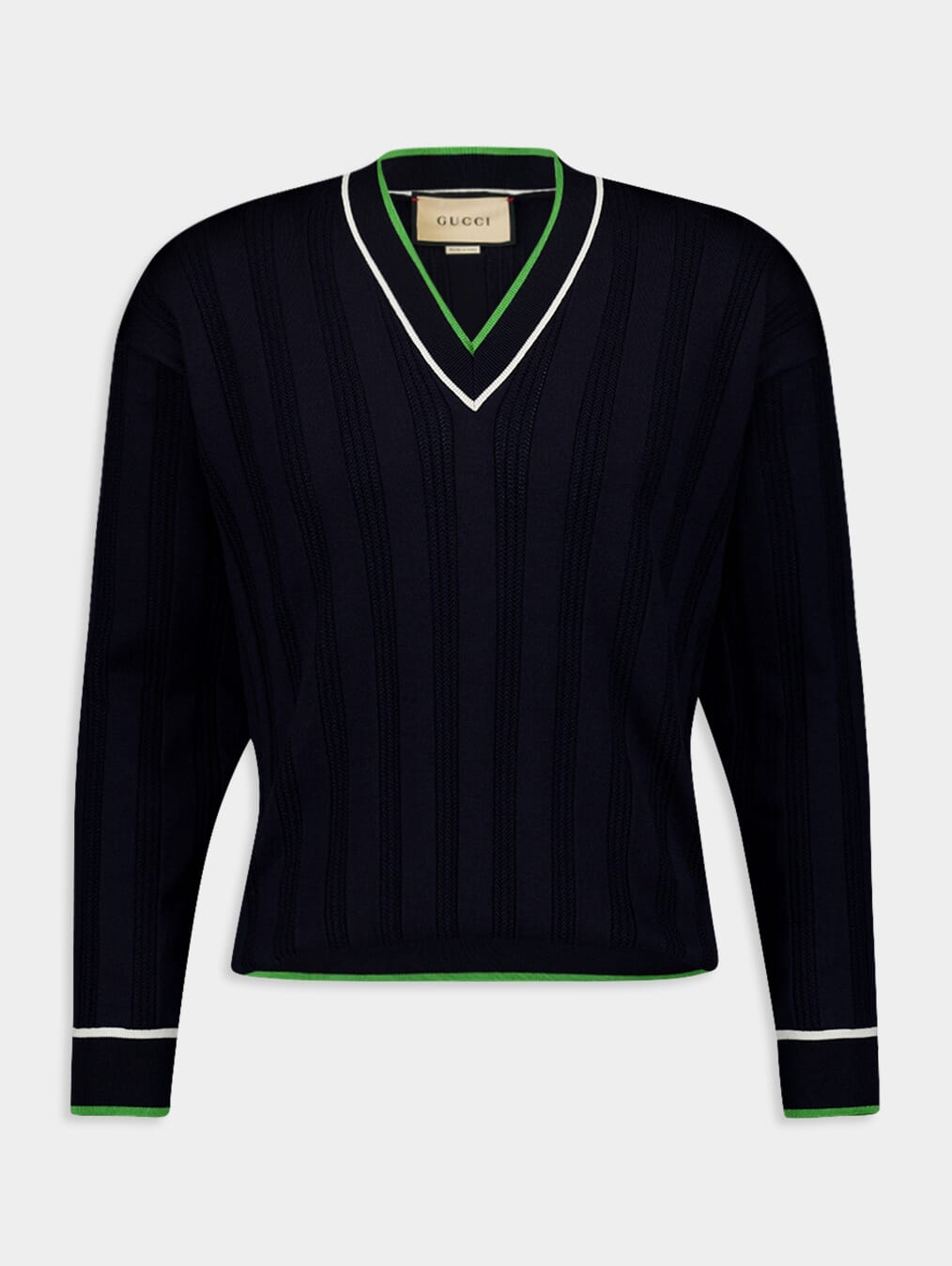 Interlocking G-Embroidered Jumper, featuring the signature Interlocking G logo for an iconic touch. This V-neck jumper exudes timeless elegance with its drop shoulder and long sleeves, ensuring both style and comfort. The contrasting trim adds a chic contrast, while the ribbed trim completes the look.