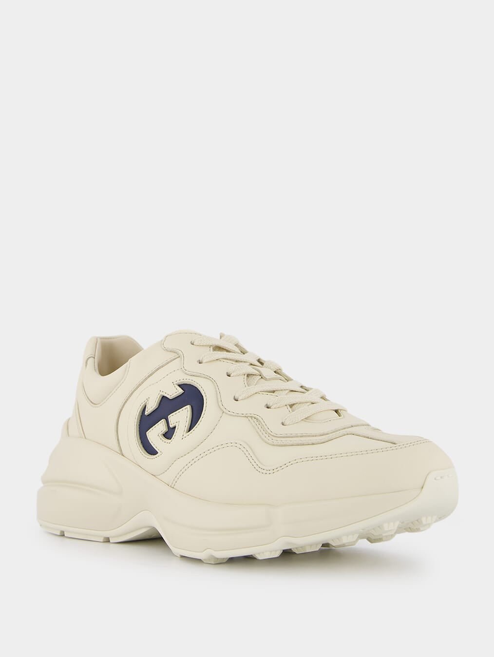 Interlocking G Rhyton Leather Sneakers, featuring the signature Interlocking G logo subtly debossed to the rear. These sneakers boast a classic round toe and a front lace-up fastening for a secure fit. Complete with a logo patch at the tongue and a branded leather insole, these sneakers offer both style and comfort. The chunky rubber sole not only adds a trendy touch but also ensures durability and support.
