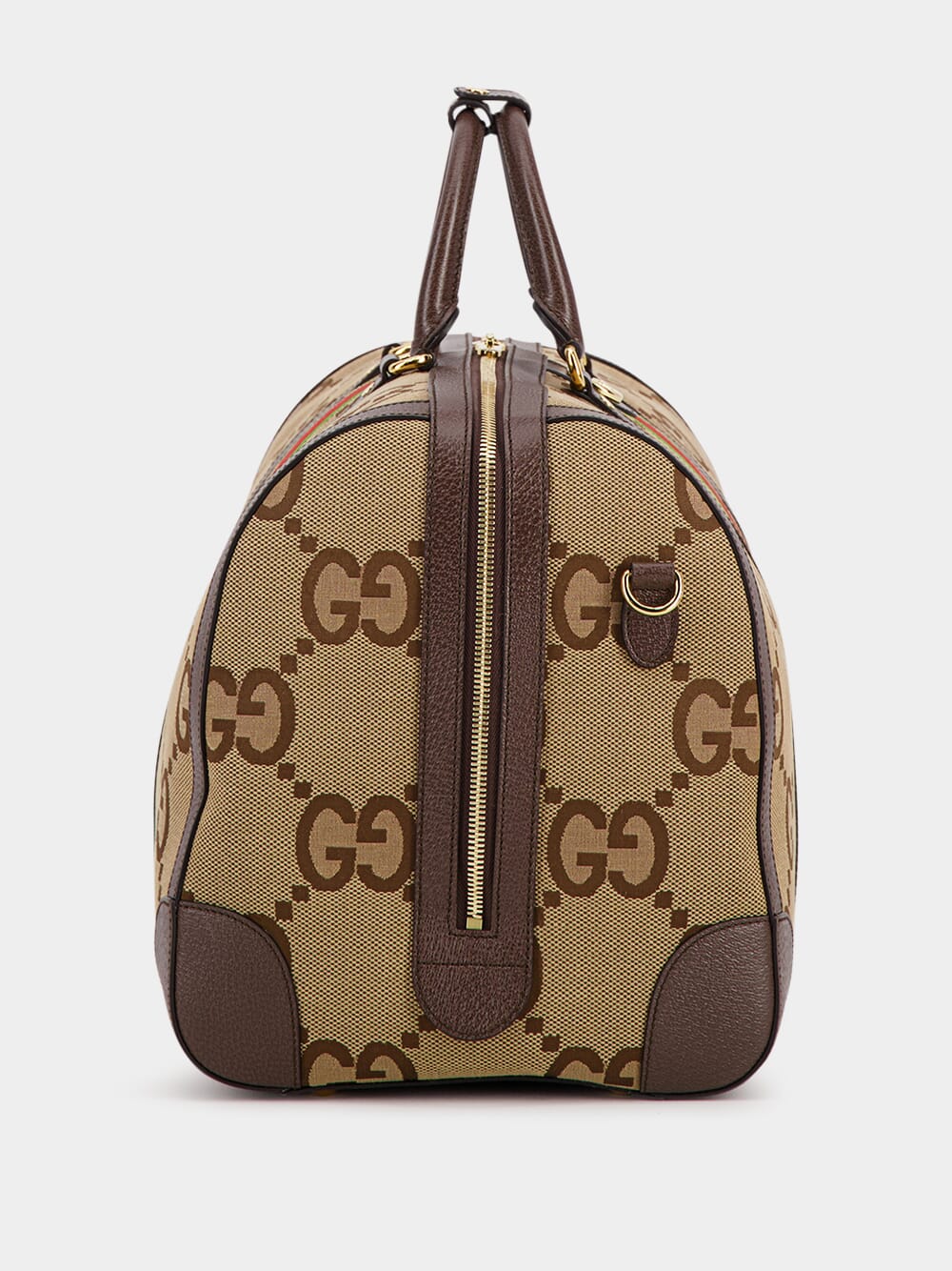 Jumbo GG Large Duffle Bag, crafted with classic GG canvas and accentuated with stripe detailing, this bag exudes timeless elegance. The signature Interlocking G logo adds a touch of sophistication to its exterior. With two top handles and an adjustable detachable shoulder strap, this bag offers versatility and comfort during travel. The top zip fastening ensures the security of your belongings, while the main compartment provides ample space for all your essentials.