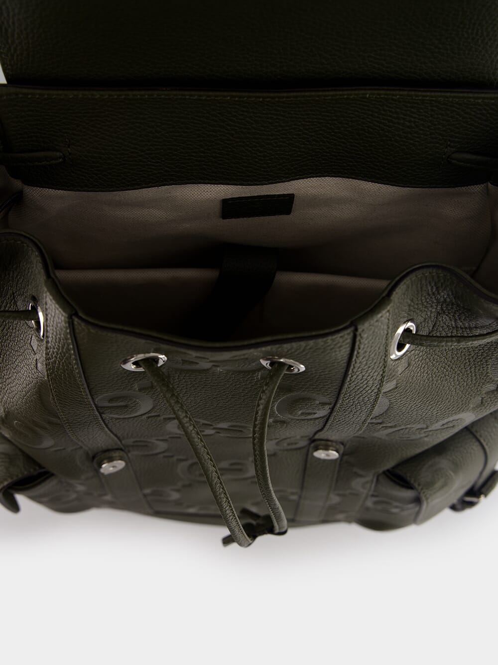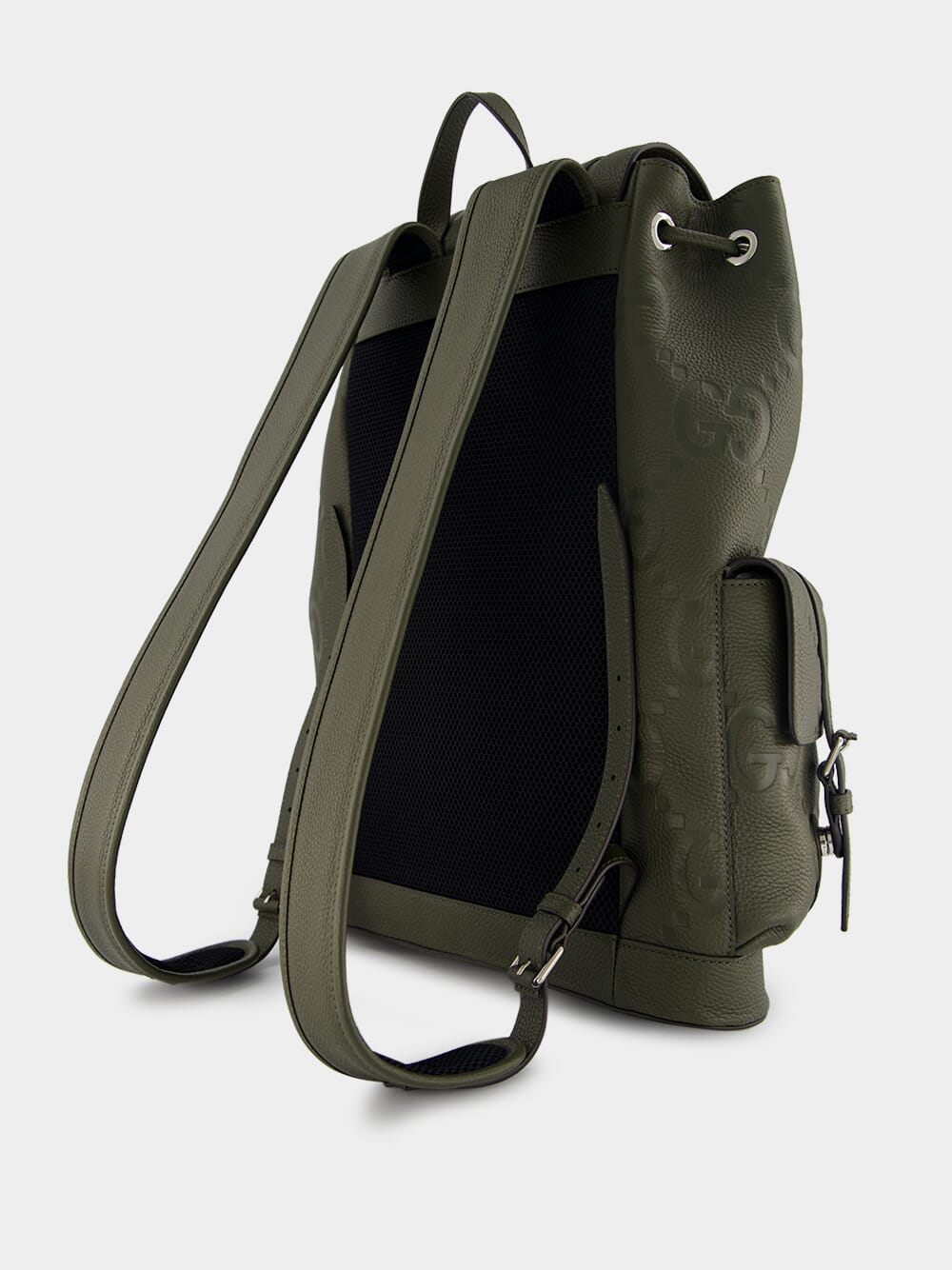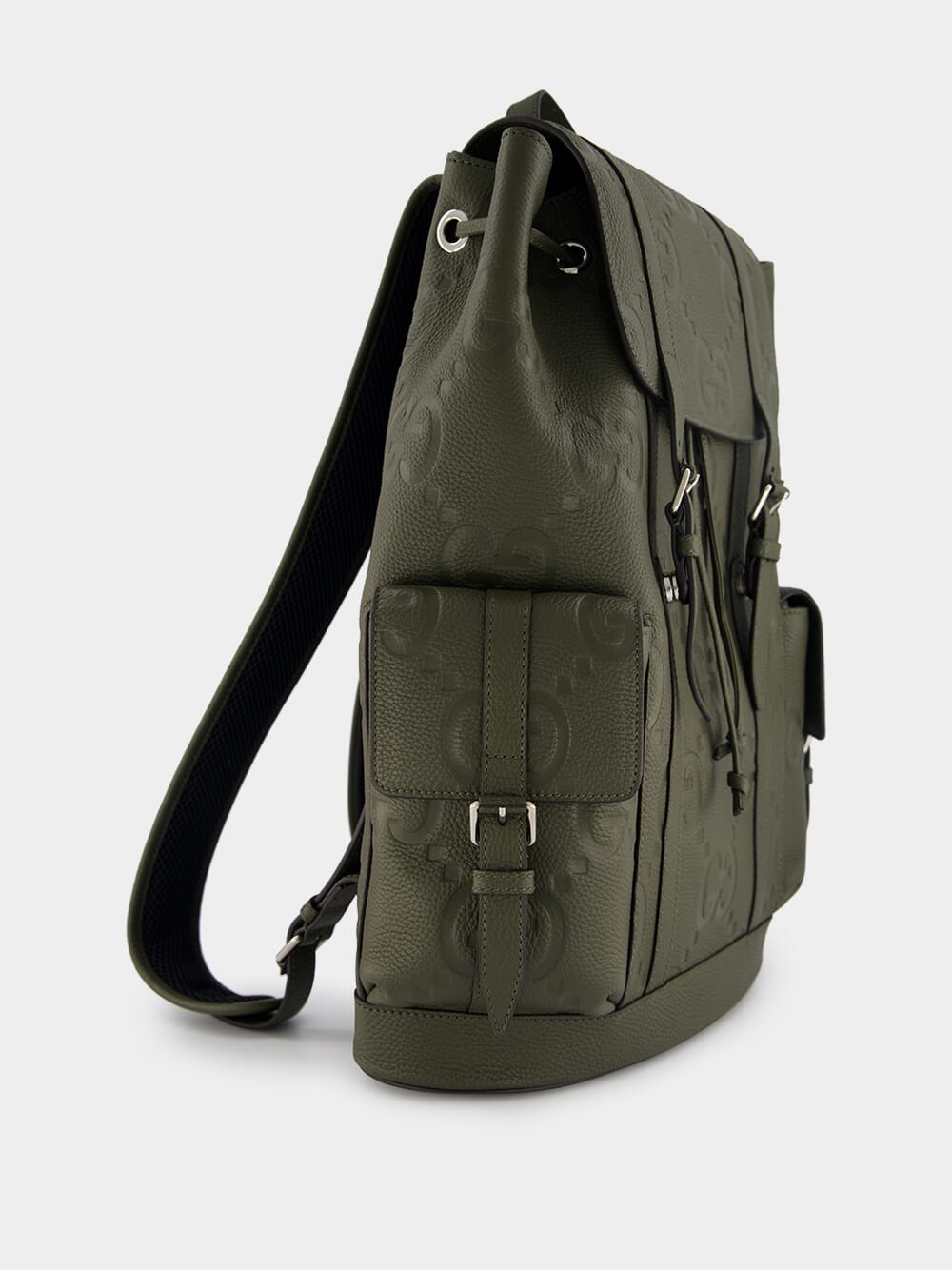 Jumbo GG Leather Backpack, crafted with iconic Jumbo GG canvas, it features two convenient side cargo pockets for added storage. The single top handle and secure buckle fastening ensure both ease of use and security. Enjoy comfortable wear with adjustable shoulder straps, while the internal padded laptop pocket provides optimal protection. Experience spacious organization in the main compartment, where fashion meets practicality seamlessly.