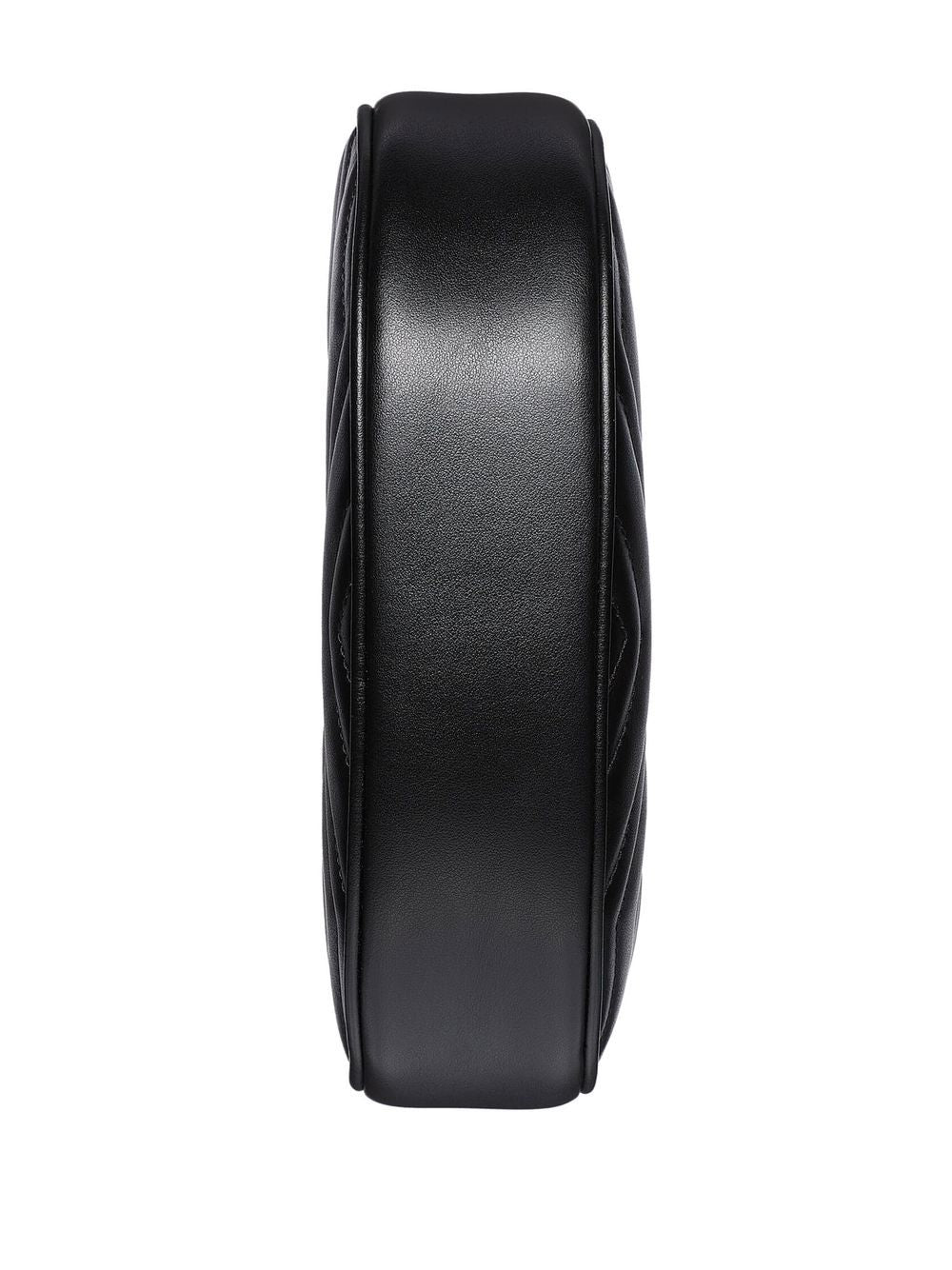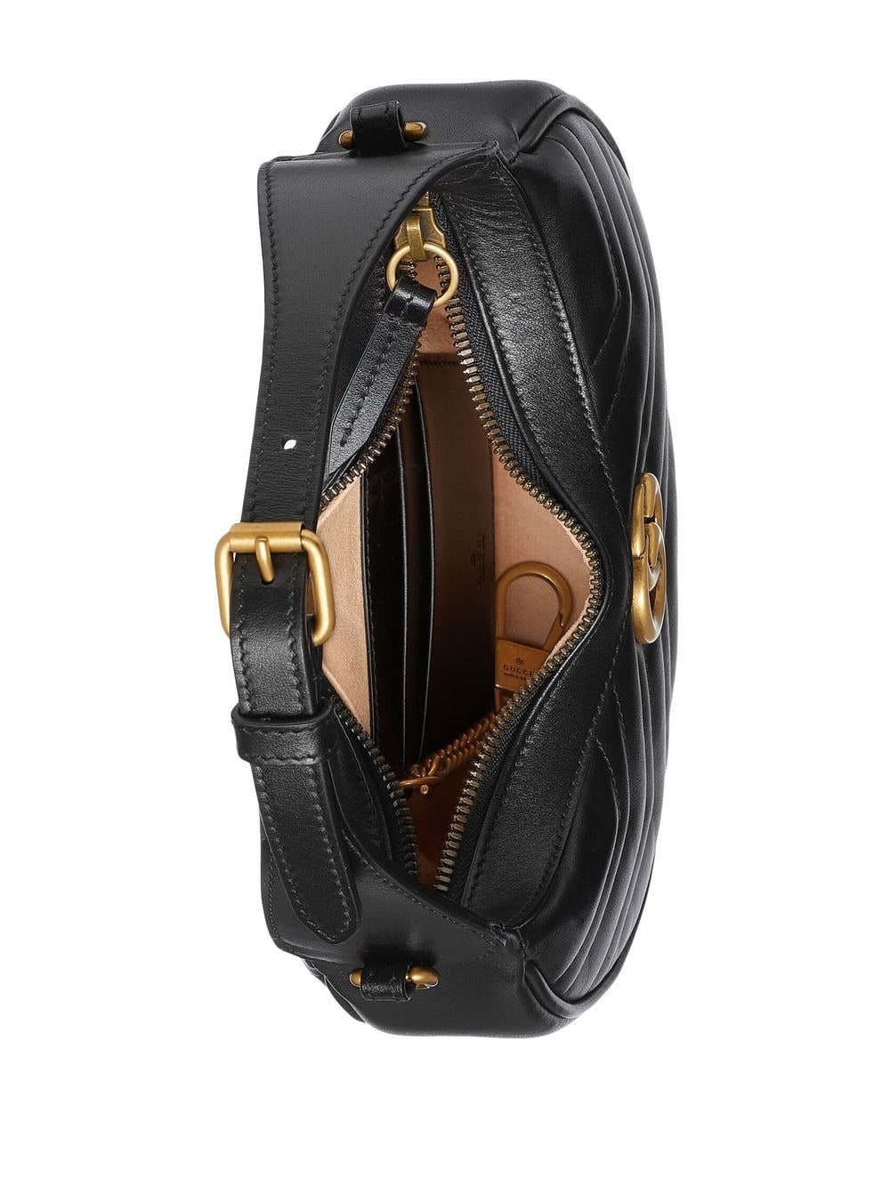 Gucci GG Marmont half-moon-shaped mini bag in black matelassé chevron leather with antique double G gold-toned hardware. Moiré and microfibre lining with suede-like finish with 2 card slots and 1 hook inside and zip closure. Adjustable handle with 16cm drop and chain shoulder strap with 60cm drop.