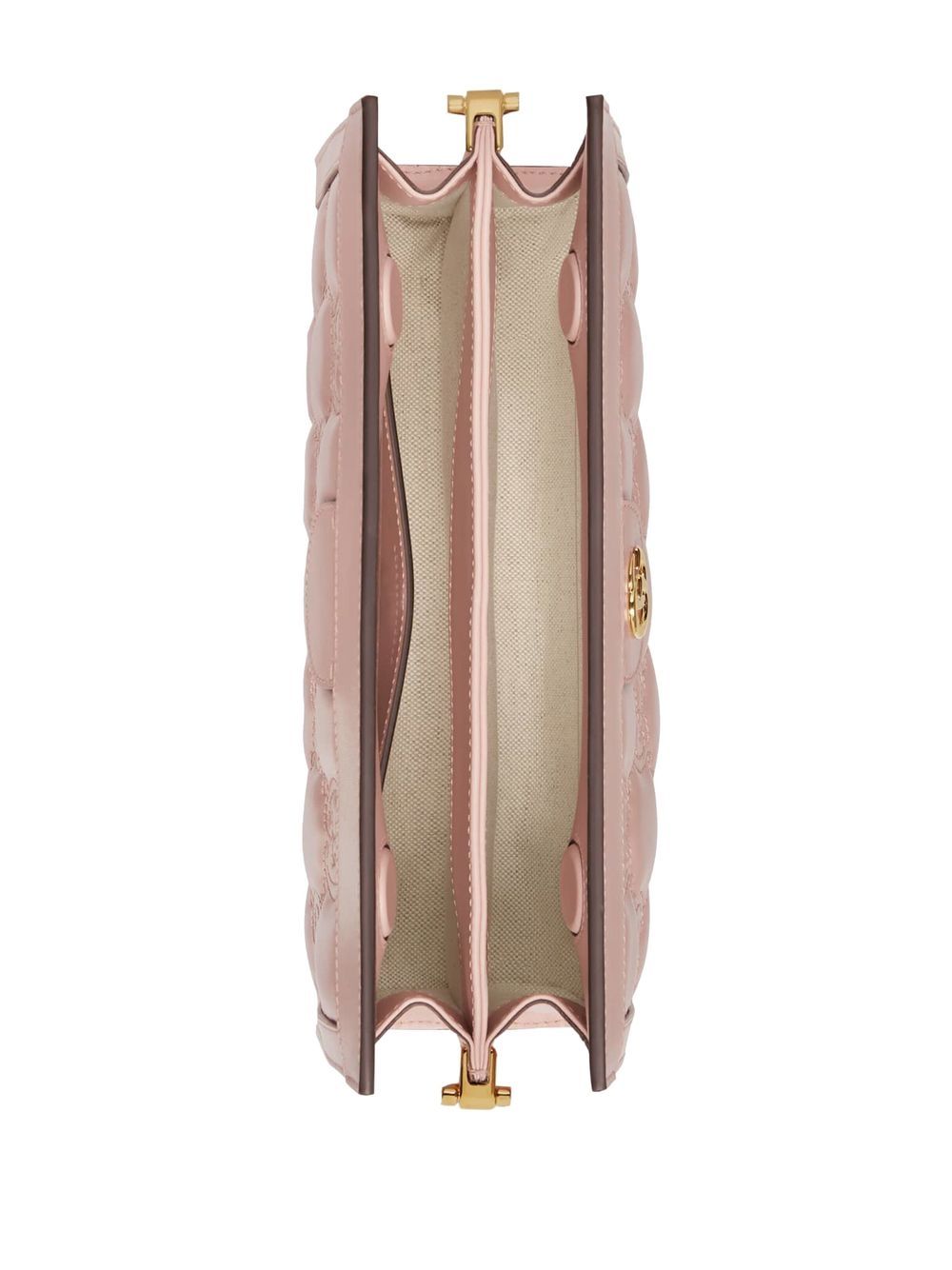 Gucci Ophidia GG Metalassé small shoulder bag in pink leather with embossed monogram and gold-toned hardware.