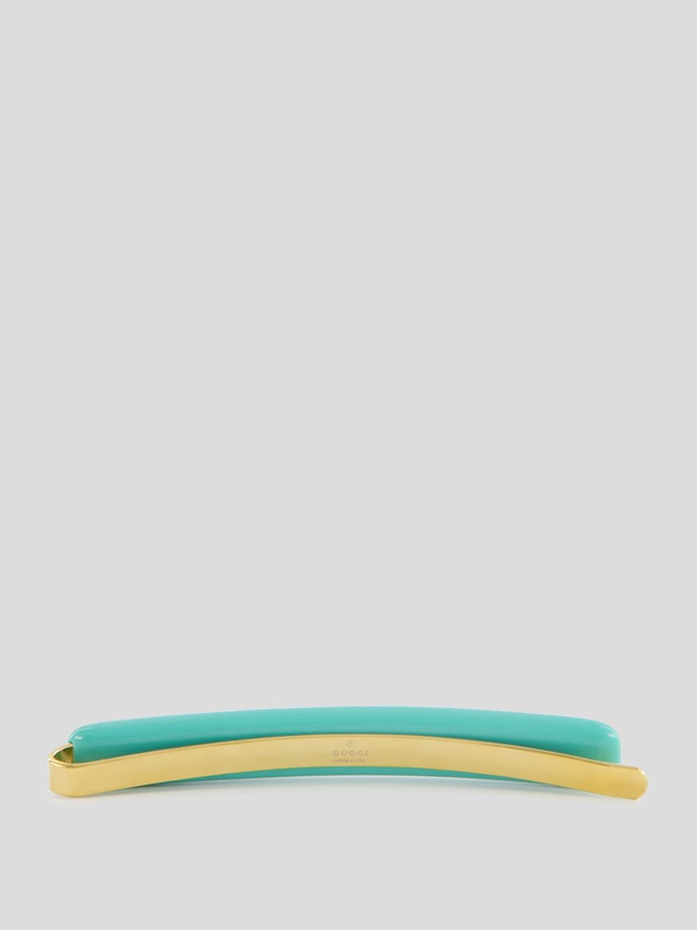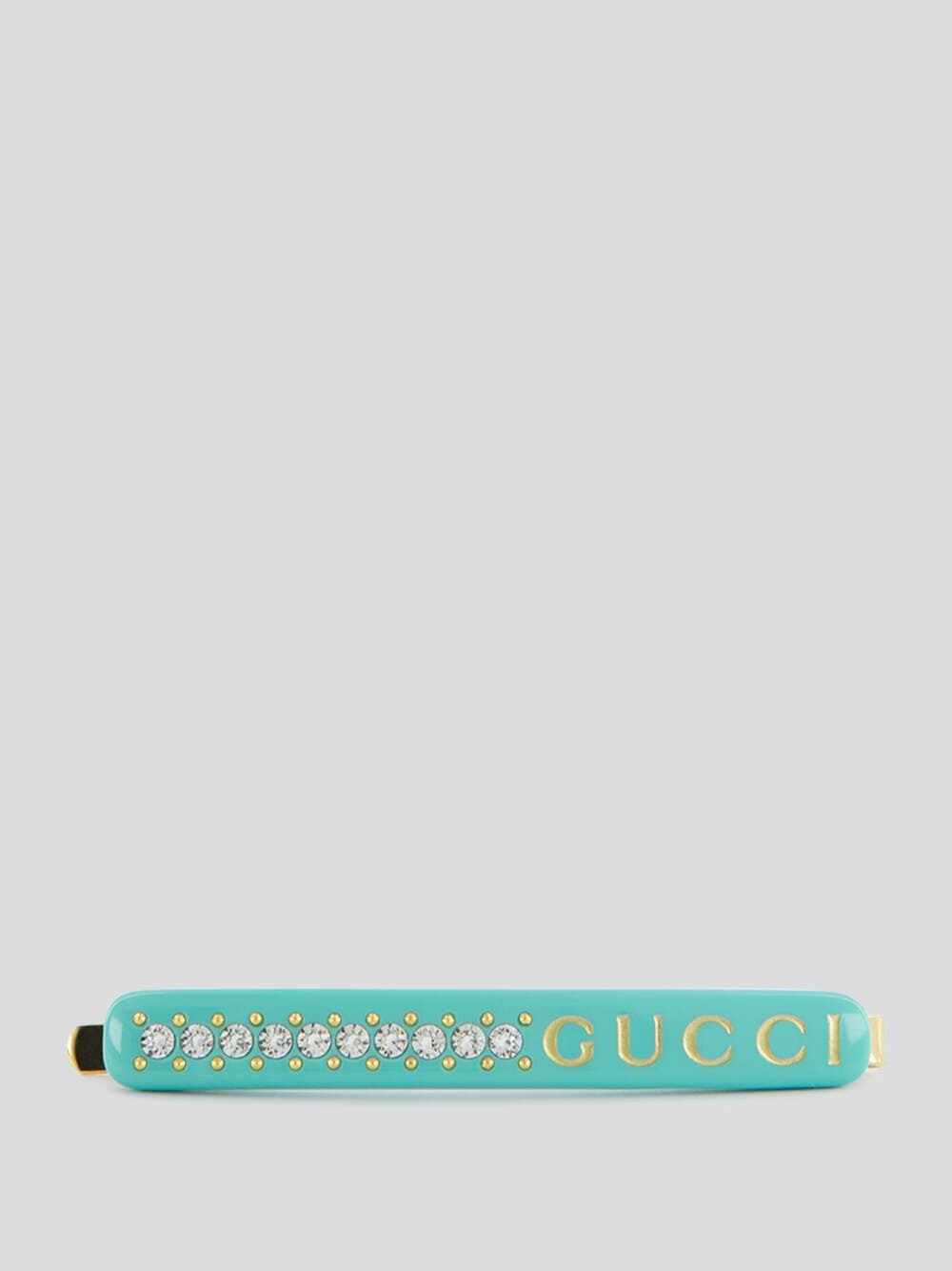 Crystal-Embellished Hair Clip, a must-have accessory for adding a touch of sparkle to your hair. Adorned with a dazzling crystal trim, this hair clip catches the light and adds a luxurious touch to any hairstyle. Crafted with a gold-toned metal base, it offers durability and style. The 'GUCCI' logo detail showcases the brand's iconic flair. With its metal barrette design, this hair clip ensures a secure and comfortable
