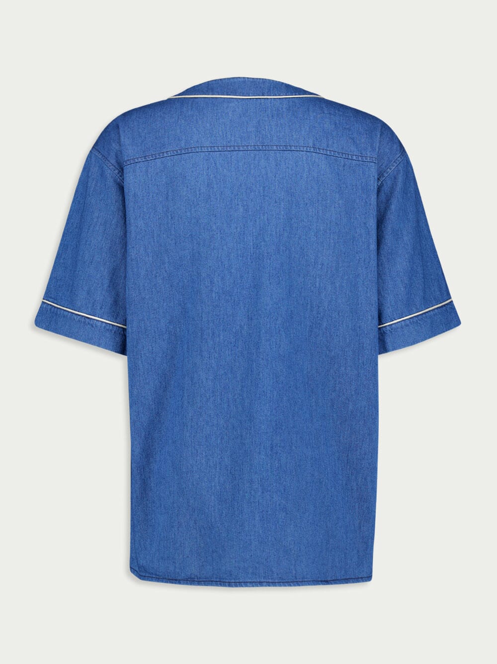 Logo-Patch Denim Shirt, featuring a striking logo patch at the chest for a statement-making look. Stay effortlessly stylish with a collarless design and front button fastening, while a chest patch pocket adds a touch of practicality. Embrace modern flair with side patch pockets and short sleeves, exuding contemporary charm. Complete your ensemble with the denim shirt's sleek straight hem, blending fashion and versatility seamlessly.