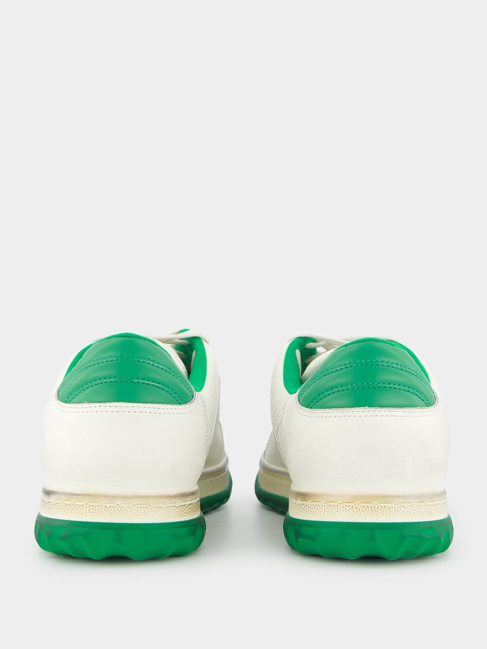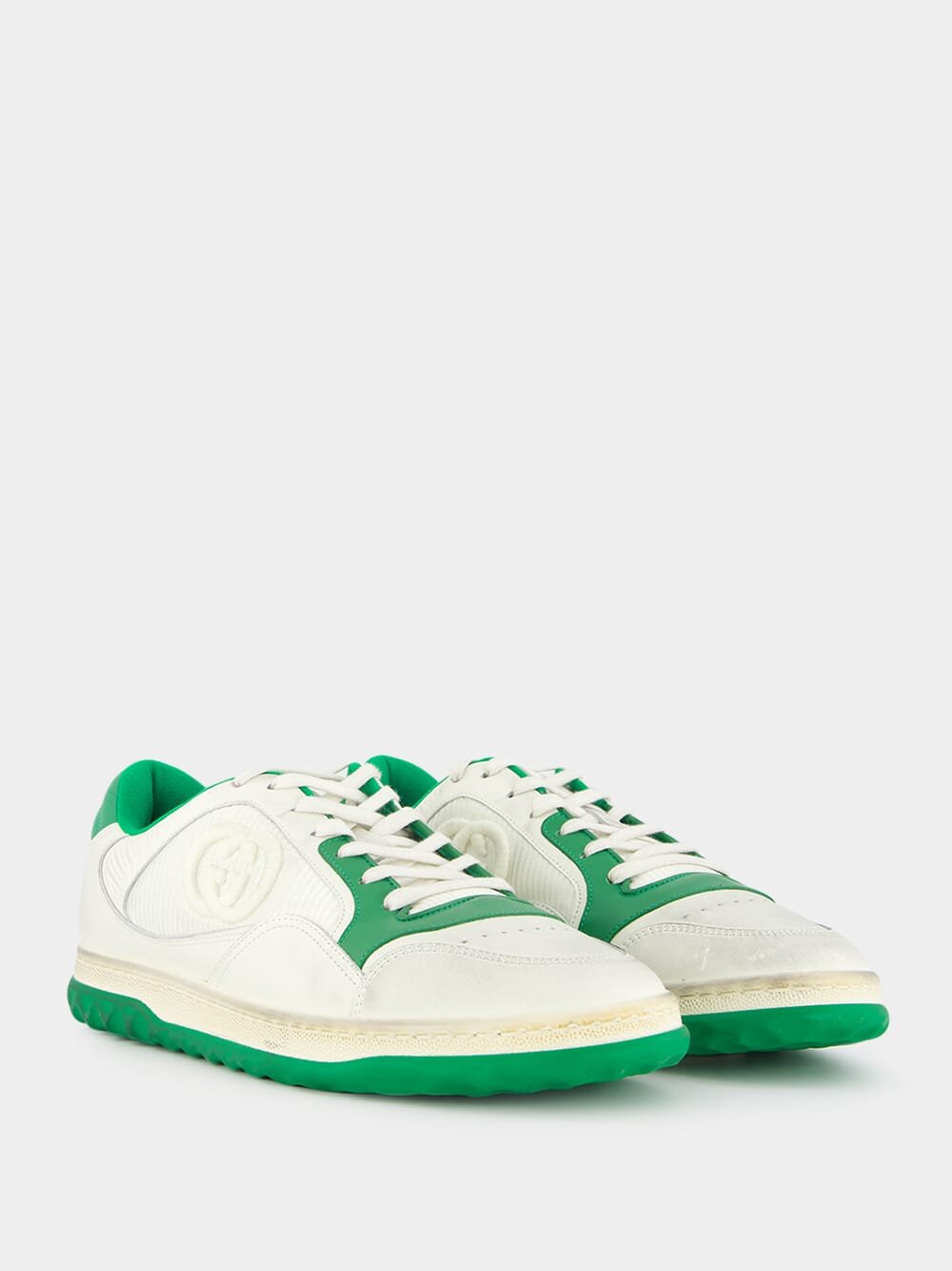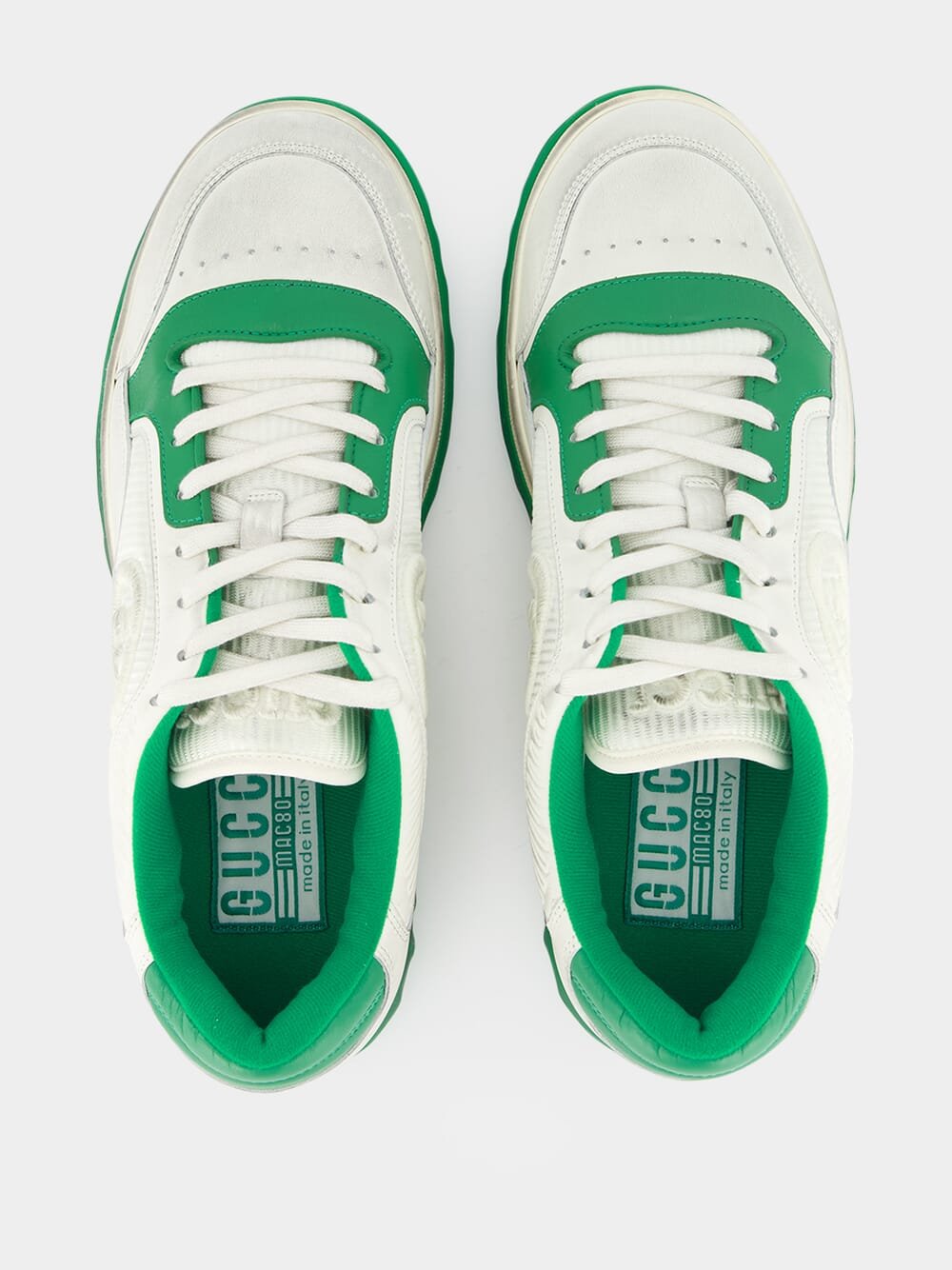 MAC80 sneakers a stunning blend of off-white and green leather for men. The off-white fabric insert and interlocking G embroidery add a touch of luxury and sophistication. Designed with a round toe and rubber sole, these trainers offer maximum comfort and support for all-day wear. The Gucci embroidery adds an iconic touch to your ensemble.