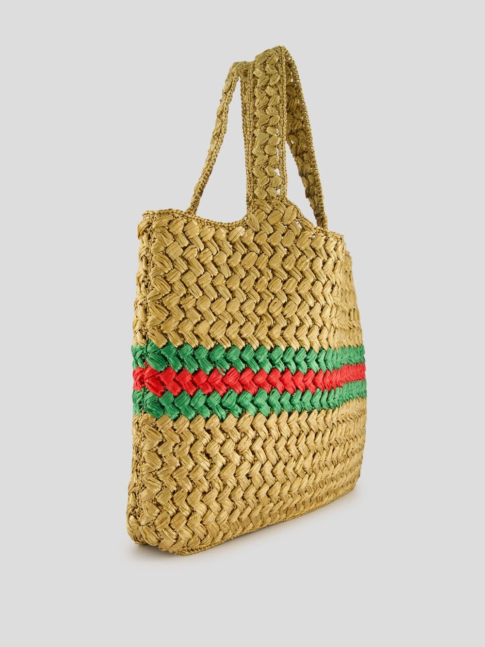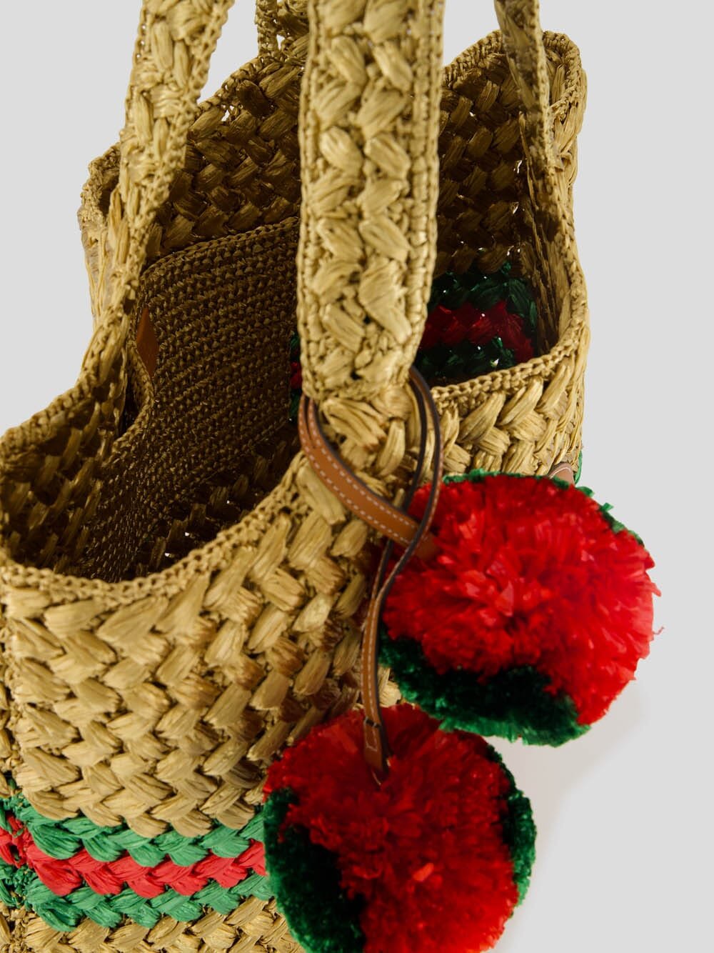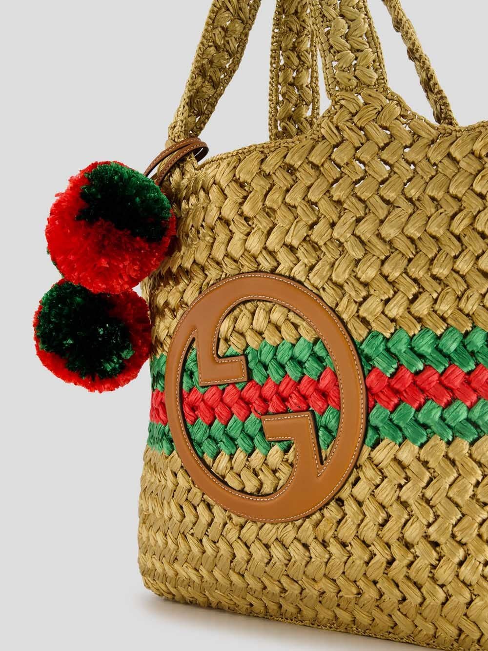 Medium Tote Bag in Natural Raffia Effect, crafted with natural raffia effect viscose, this bag showcases a sustainable and environmentally-conscious choice. The round Interlocking G leather patch adds a touch of sophistication, representing the iconic Gucci emblem. Two detachable pom poms bring a playful and trendy element to its design. Inside, you'll find a convenient open pocket, perfect for organizing your essentials. The double handles provide a comfortable and stylish carrying option.