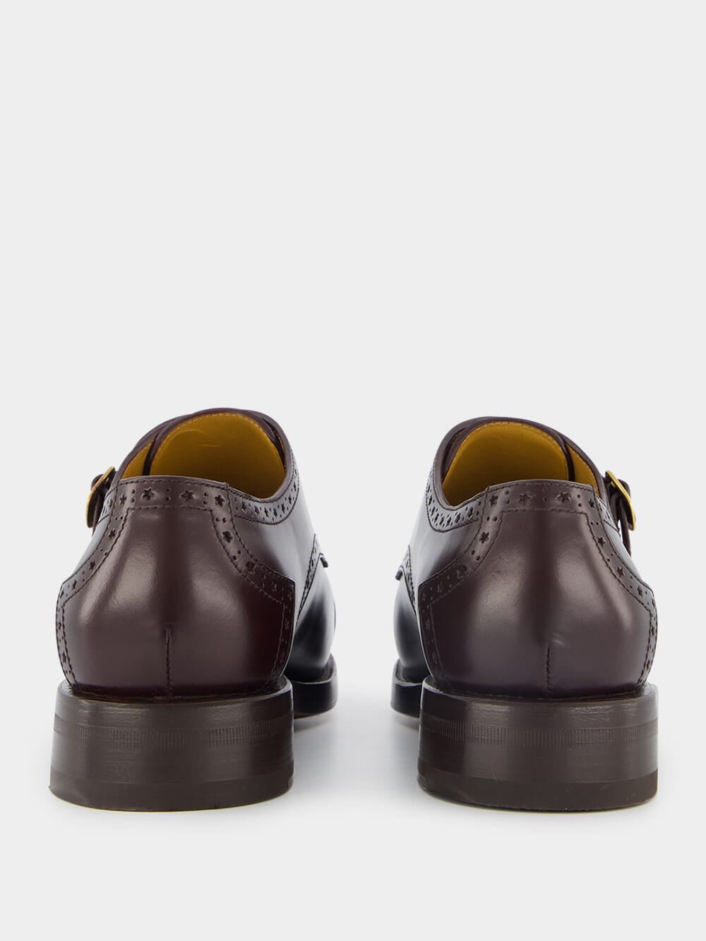 Monk Strap Shoe crafted with dark bordeaux leather for men who appreciate timeless sophistication. The gold-toned hardware adds a touch of luxury, complementing the classic appeal. With a durable leather sole and goodyear construction, these shoes ensure exceptional quality and longevity. The convenient buckle closure allows for a secure fit, while the low heel offers both style and comfort for all-day wear.