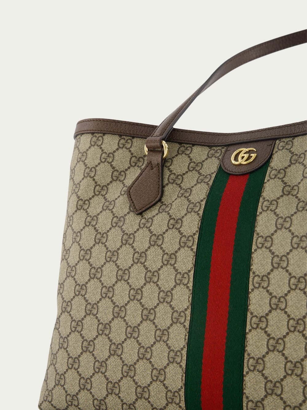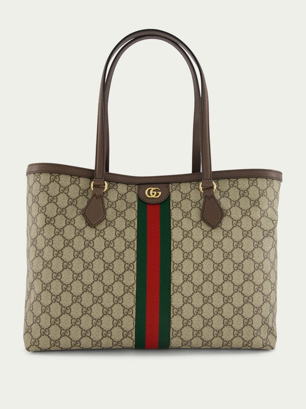Gucci Ophidia softly strutured beige and ebony GG Supreme canvas and brown leather medium tote bag with green and red web and two leather top handles.