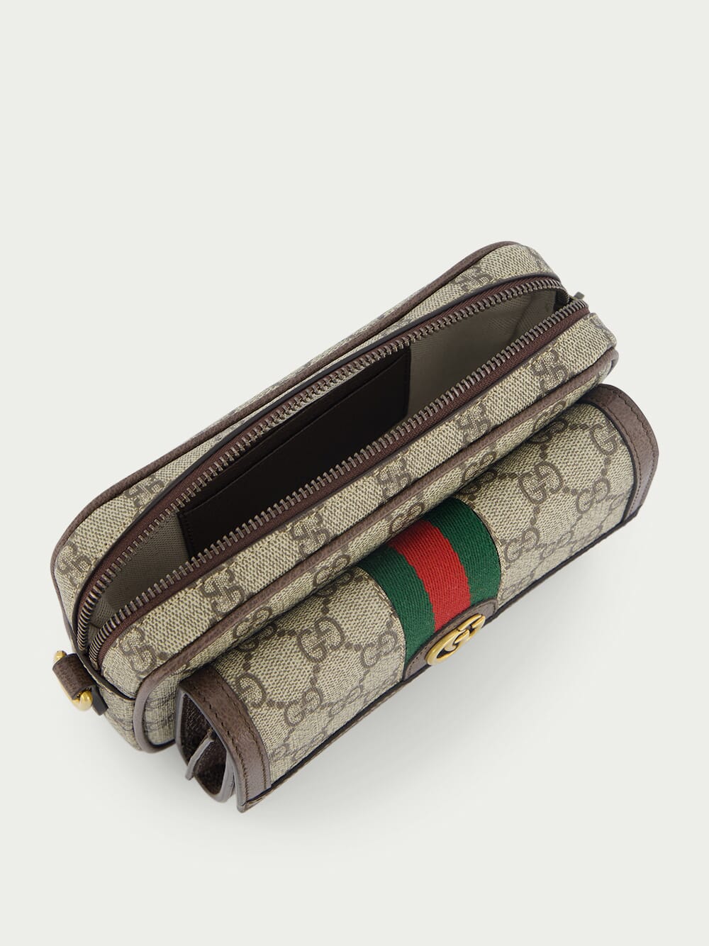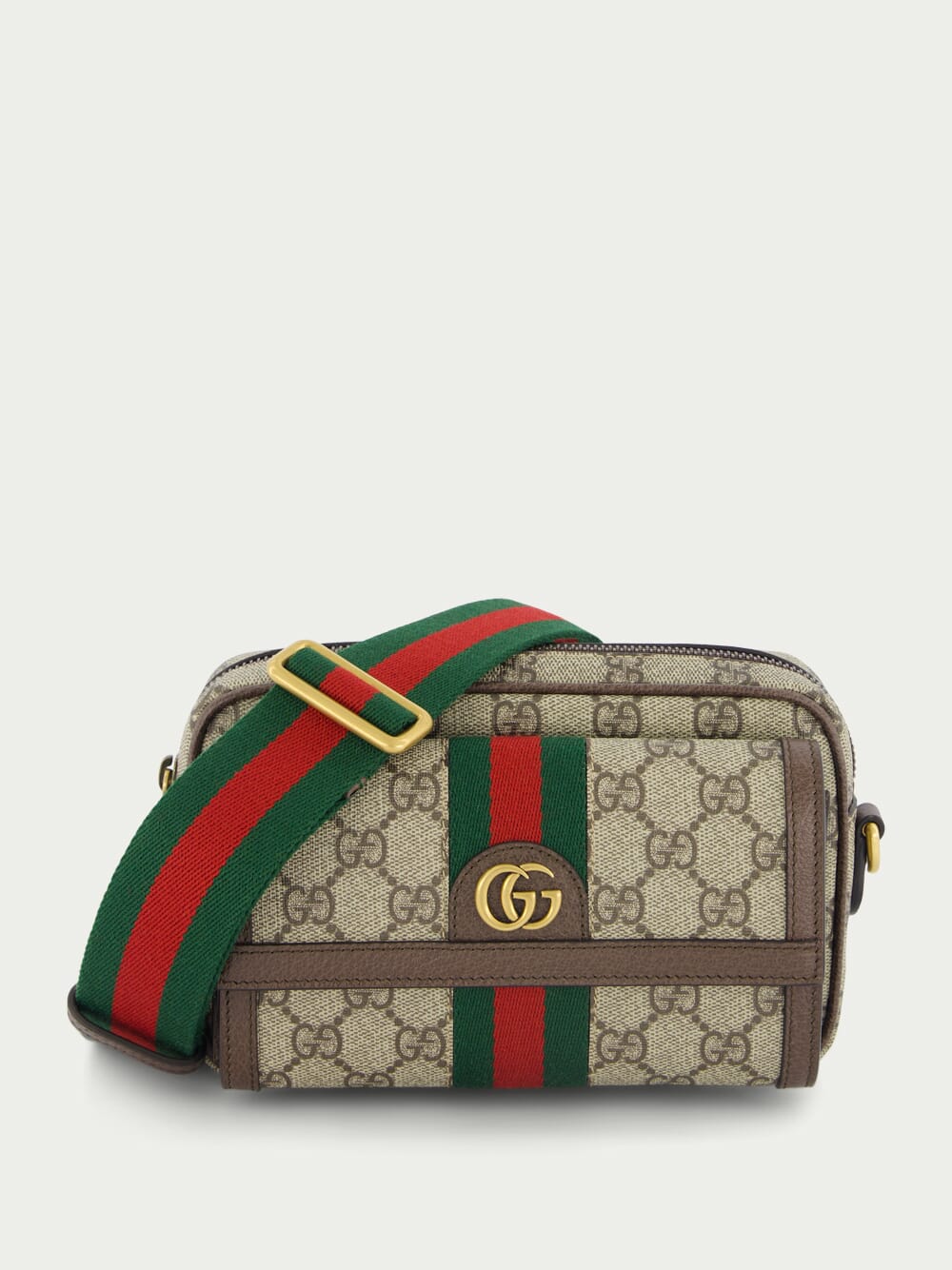 Ophidia GG Mini Bag, featuring a captivating combination of beige and ebony GG Supreme canvas, highlighted by brown leather trim and gold-toned hardware. The iconic green and red Web detail pays homage to our heritage, while the moiré and cotton linen lining adds a touch of luxury and durability. Adorned with the distinguished Double G logo, this mini bag embodies our signature style. It comes with a detachable canvas shoulder strap, providing versatile carrying options.