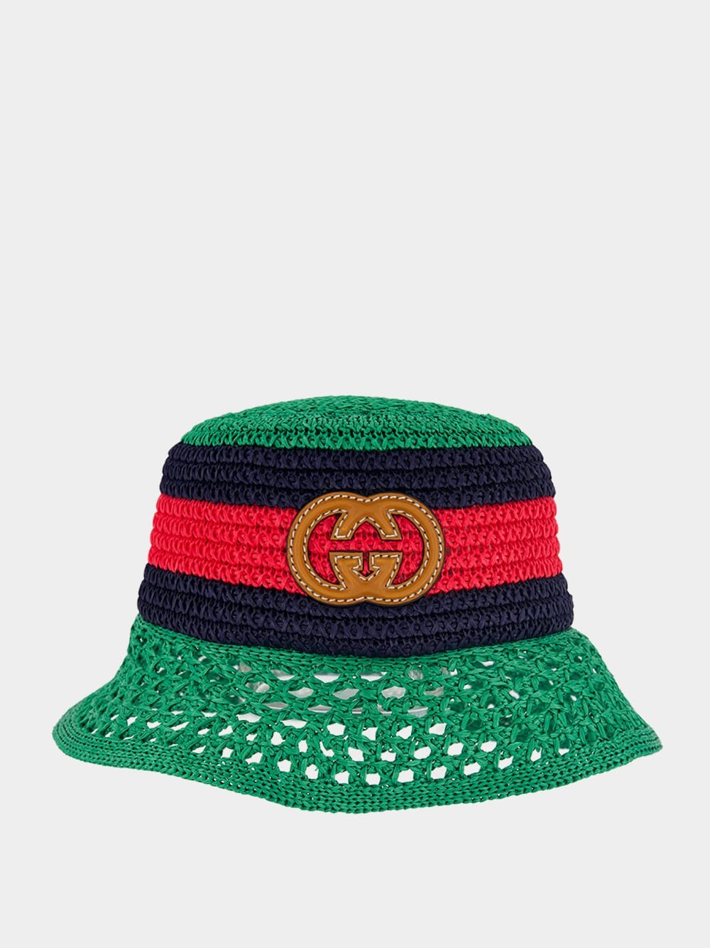 Raffia-Effect Viscose Bucket Hat, crafted with a raffia-effect viscose material, it offers a chic and lightweight design. The hat is adorned with an Interlocking G leather patch, adding a touch of luxury and sophistication. Unlined for breathability, this hat is perfect for sunny days.