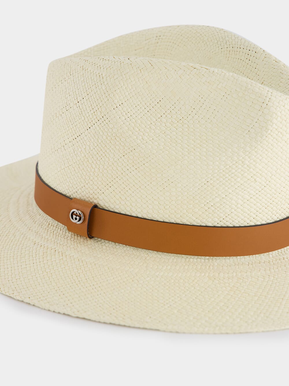 Raffia Wide-Brimmed Hat with a touch of elegance. Crafted to perfection, this hat features a stunning brown leather trim that adds a sophisticated flair to any outfit. With its palladium-toned hardware, it exudes a luxurious appeal that catches the eye. Designed for comfort and style, this hat is unlined, offering a lightweight and breathable experience, perfect for those sunny days. Its wide brim provides excellent sun protection while adding a fashionable edge to your look. Adding to its allure, this hat showcases an interlocking G detail, making it a symbol of refined taste and impeccable craftsmanship.