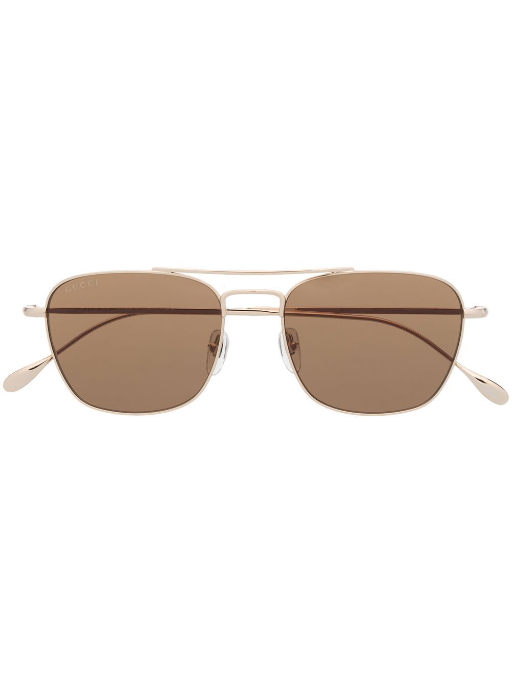 Gucci black shiny golden metal rectangular frames sunglasses with solid brown lens and golden metal frames.