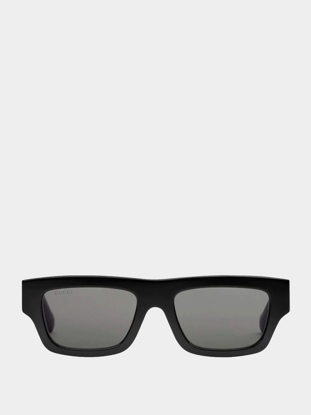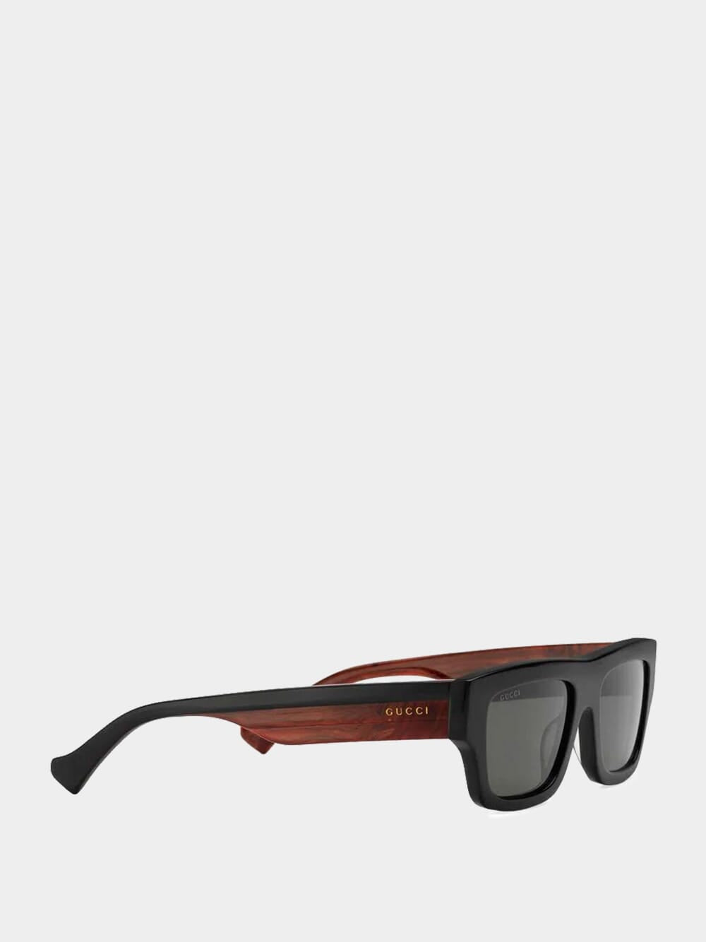 Gucci rectangular frame sunglasses featuring acetate temples with Gucci logo detail.