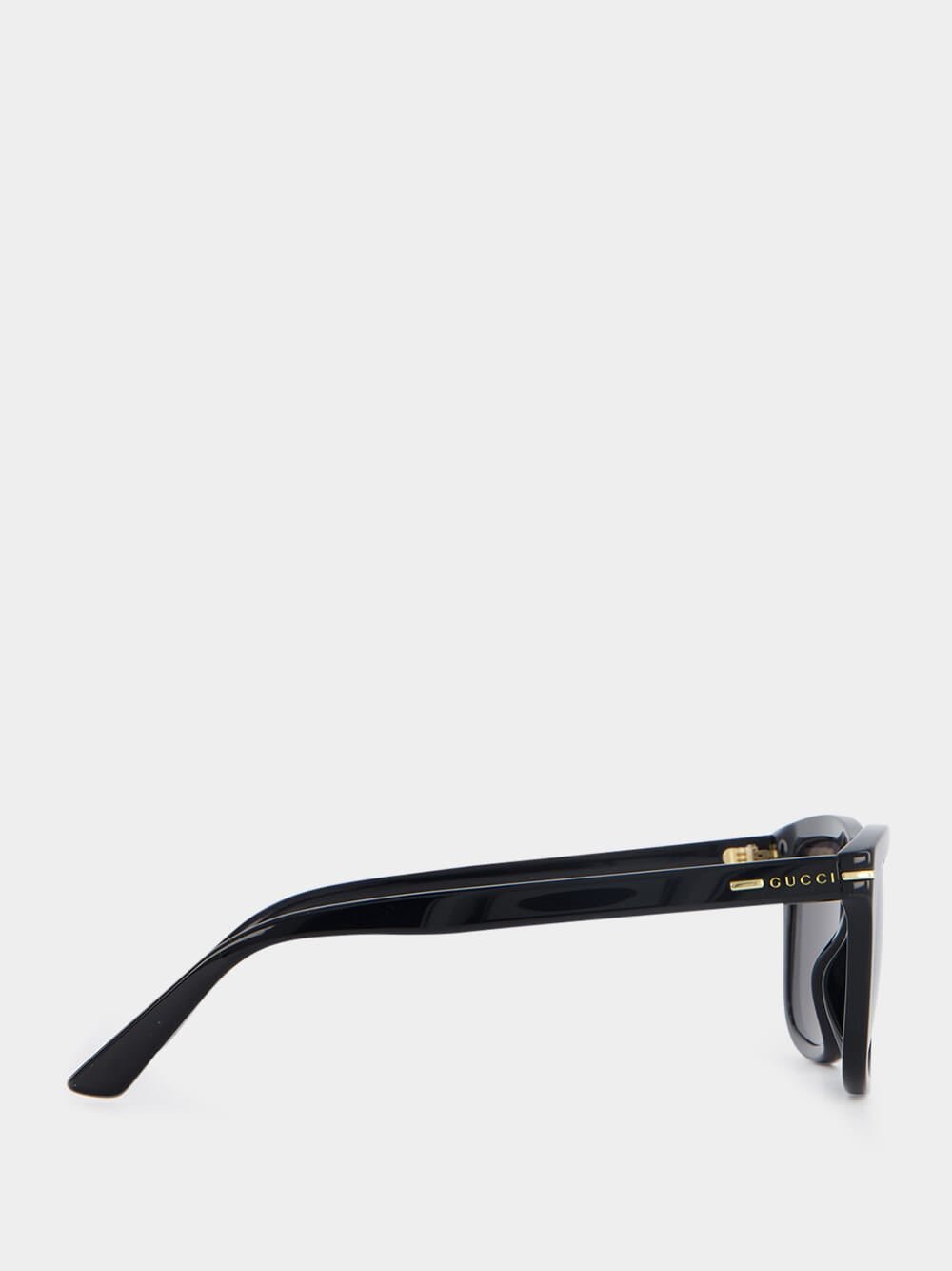 Rectangular Frame Sunglasses, featuring a shiny black acetate frame and temples adorned with Gucci lettering. The solid grey lens not only offers a stylish look but also provides 100% UVA/UVB protection, ensuring optimal eye safety. With their timeless design and superior quality, these sunglasses are perfect for any occasion.