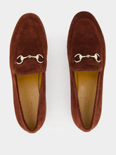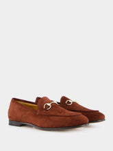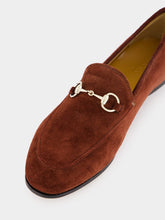 The Women's Suede Horsebit Loafers epitomize classic elegance, crafted in dark brown suede and accented with light gold-toned hardware. The iconic Horsebit detail and leather sole flat ensure a timeless and sophisticated look.
