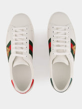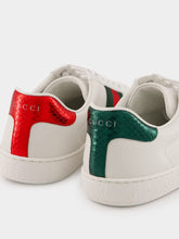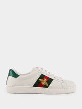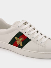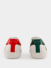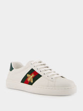 The White Ace Sneaker features a low-top design in leather, adorned with a gold embroidered bee on the iconic green and red Web stripe. This archival detail, introduced in the 1970s, adds a touch of heritage to the modern silhouette. With contrasting red leather on the heel of one shoe and green on the other, these sneakers offer a unique, eye-catching style. Made with a rubber sole, these flat sneakers are crafted in Italy, blending luxury and comfort seamlessly.