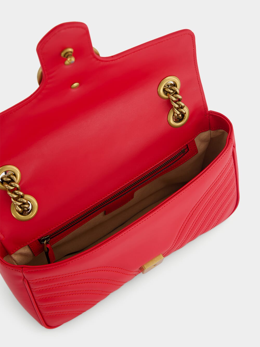 Small GG Marmont Shoulder Bag, featuring the iconic signature Marmont quilting. This exquisite bag showcases the renowned Interlocking G logo plaque, a symbol of luxury and refinement. The foldover top adds a touch of elegance, while the adjustable leather and chain-link shoulder strap offers versatility and comfort. With its spacious main compartment, you can effortlessly organize your belongings, and the internal slip pocket provides convenient storage for small essentials.