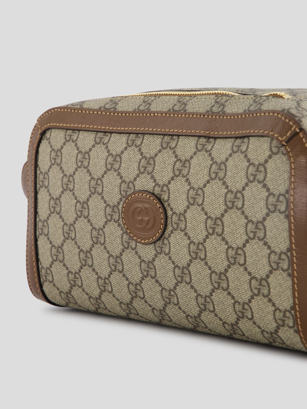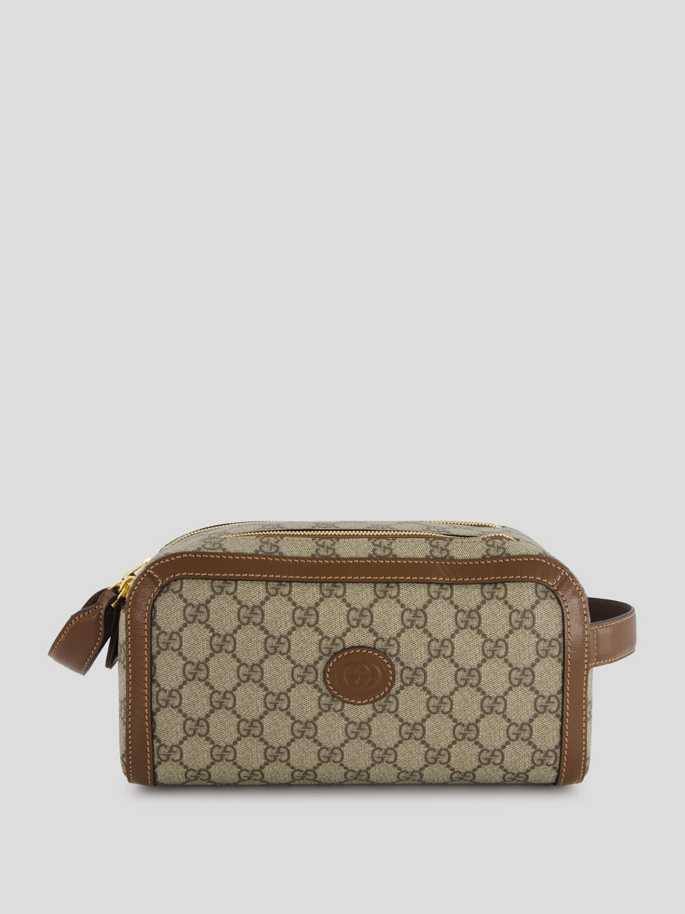 Toiletry Case with Interlocking G crafted from the iconic Beige and Ebony GG Supreme canvas with brown leather trim, this case exudes a timeless and sophisticated aesthetic. The oval shape and interlocking G leather tag showcase exquisite attention to detail. With its convenient outside handle, it offers easy carrying. The inside features an open compartment and zip closure, ensuring secure storage for your toiletries.