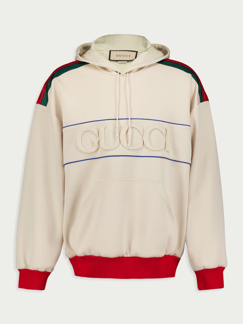 Web-Stripe Logo-Embossed Hoodie, expertly designed with signature Web detailing for a touch of sophistication. Elevate your look with unique mesh detailing and an embossed logo gracing the front, exuding modern elegance. Stay cozy and on-trend with a drawstring hood, drop shoulder design, and long sleeves. Enjoy superior fit and quality with ribbed cuffs and hem, complemented by a front pouch pocket for added convenience.
