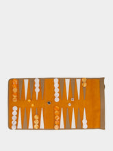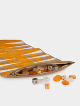 Experience the ultimate in portable gaming with the Victor travel backgammon set. Designed for convenience, this set features a roll-up format and lightweight construction, making it easy to carry in a suitcase or bag. Play anywhere, from the plane to the beach, pool, or restaurant. The chips and dice are stored in an integrated zippered pocket, and when you're done, simply use the removable smooth leather strap to roll it up again. Handcrafted in our Paris workshops, it boasts a luxurious velvet and leather finish. Includes 30 acetate stones, 4 resin dice, and a metal vido.