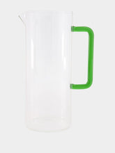 This elegant tube jug, featuring a vibrant green handle, is meticulously hand-made and flame-worked. The clear glass body highlights the sleek design and impeccable craftsmanship, making it an ideal piece for serving beverages in a modern kitchen or dining setting. The green handle adds a pop of color and ensures a comfortable grip, while the lightweight yet durable construction ensures practical use. Perfect for daily use or special occasions, this jug seamlessly blends functionality with contemporary aesthetic appeal.