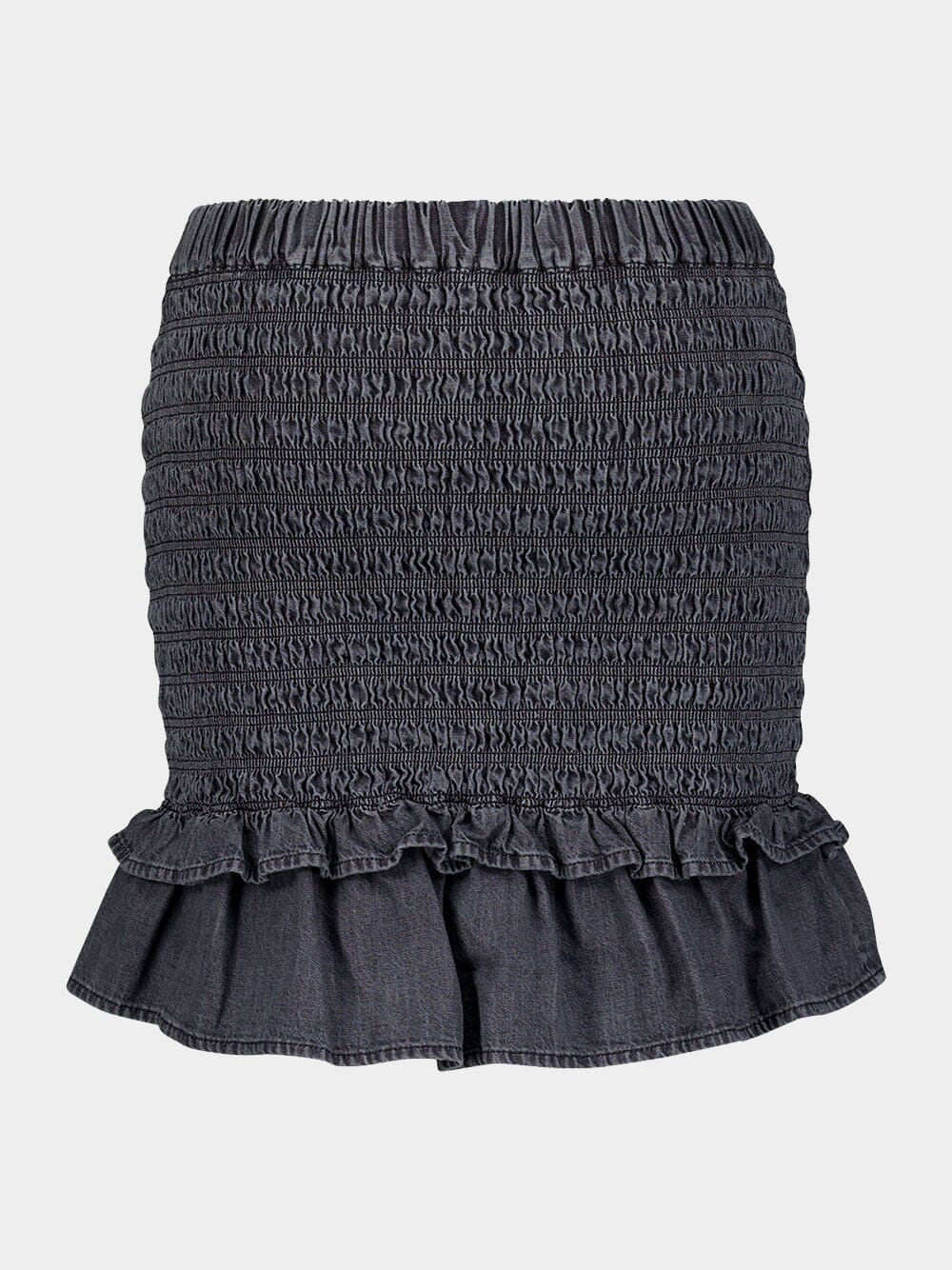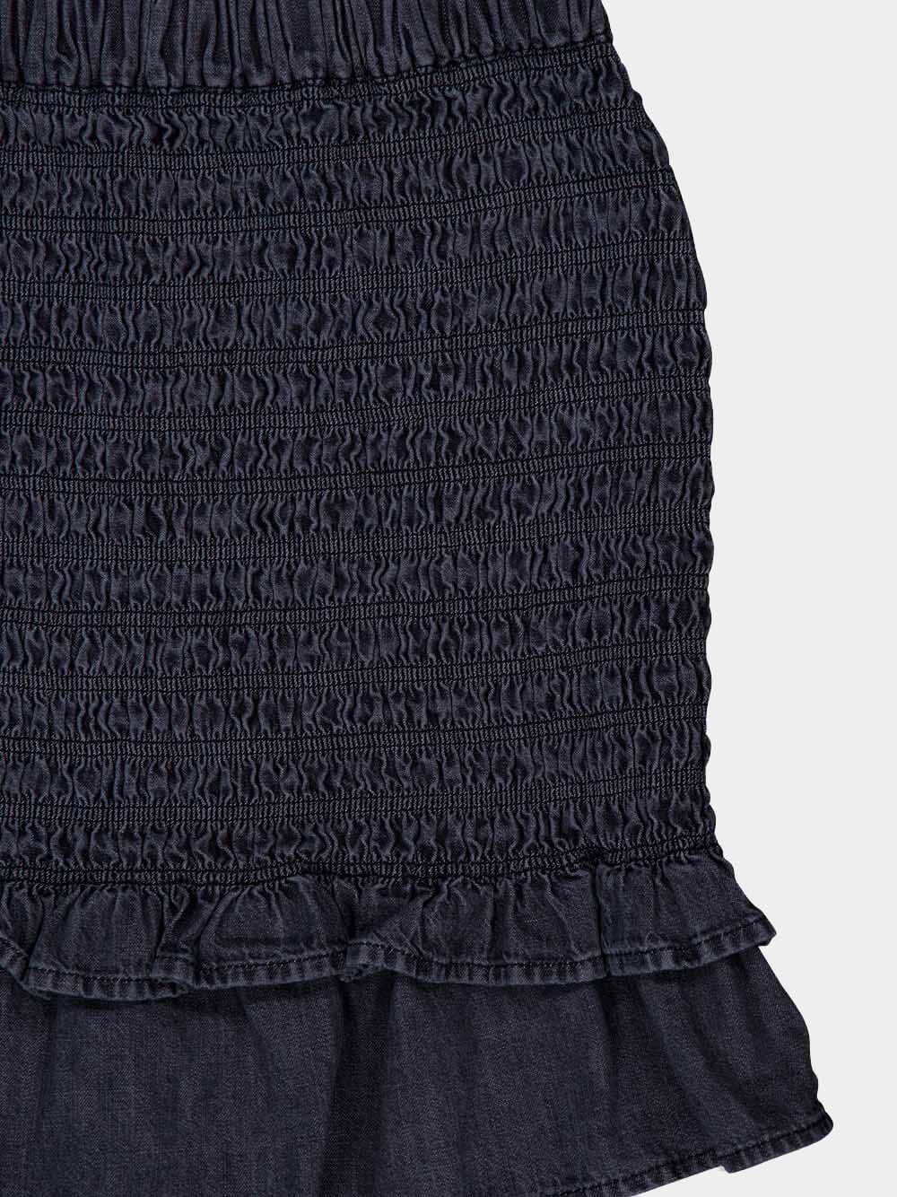 Dorela Cotton Denim Miniskirt, expertly crafted from comfortable cotton. This skirt features a shirred effect and an elasticated waistband, ensuring both a flattering fit and all-day comfort. The playful ruffle hem adds a touch of flair to its classic straight hem design. Embrace the thigh-length cut for a chic and trendy look.