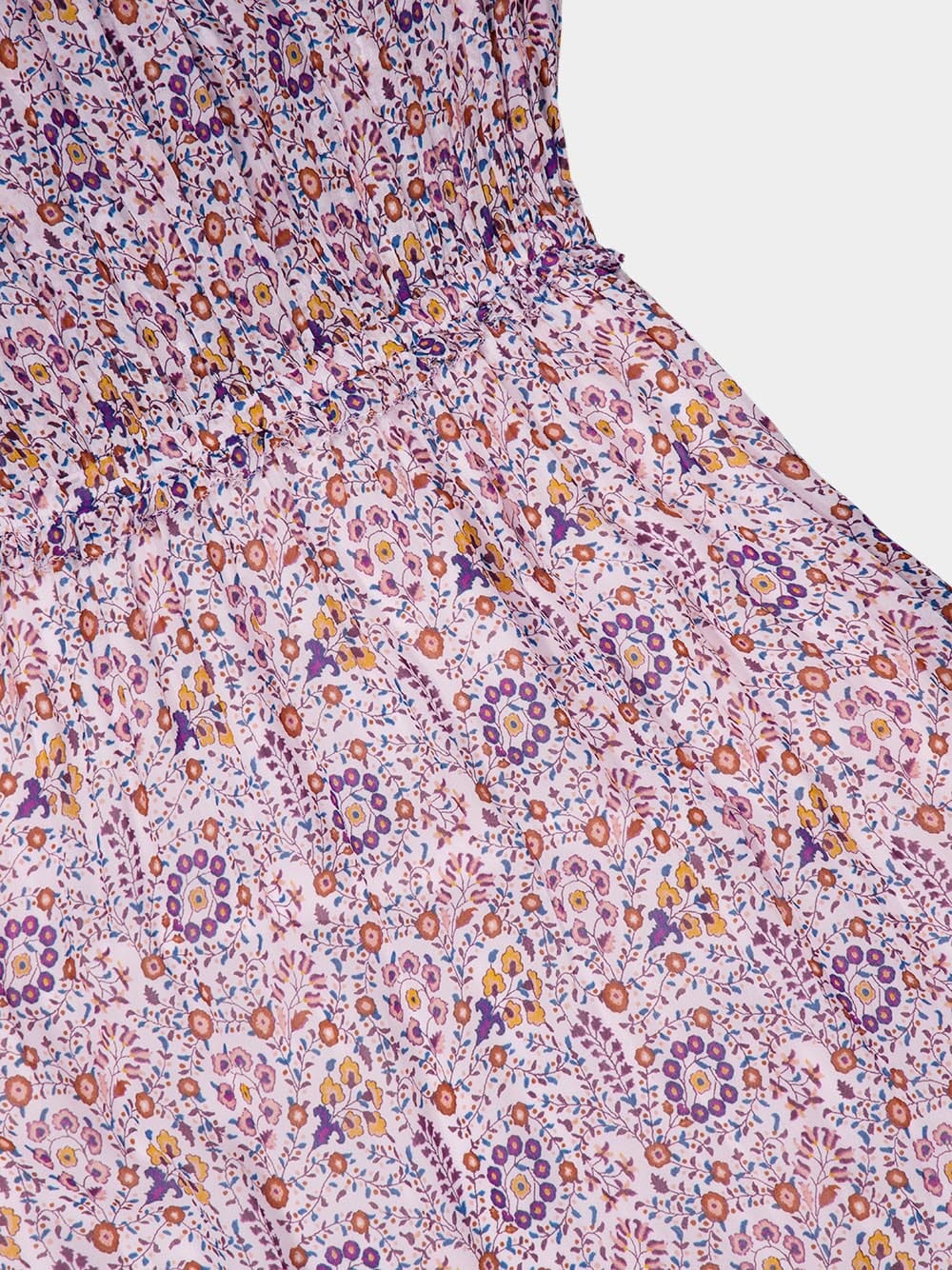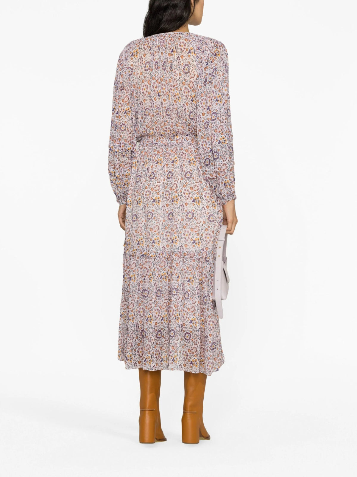Floral-Print Crepe Midi Dress, crafted from luxurious georgette crepe with an exquisite all-over floral print. This dress boasts a flattering plunging V-neck and elegant gathered tie neck for a touch of sophistication. The elasticated waistband ensures a comfortable fit, while long sleeves with elasticated cuffs offer versatility and style. The flared hem adds a playful element to the chic mid-length design.
