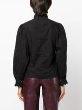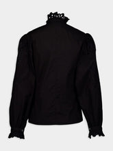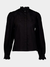 Raissa Broderie Anglaise Cotton Shirt, meticulously crafted from organic cotton for eco-conscious style. Adorned with intricate broderie anglaise detailing and tonal stitching, this shirt is a testament to timeless craftsmanship. Its high neck and concealed front button fastening offer an elegant and sophisticated touch, while long sleeves with buttoned cuffs provide versatility for various occasions. The curved hem adds a flattering finish to this ethically made wardrobe staple.