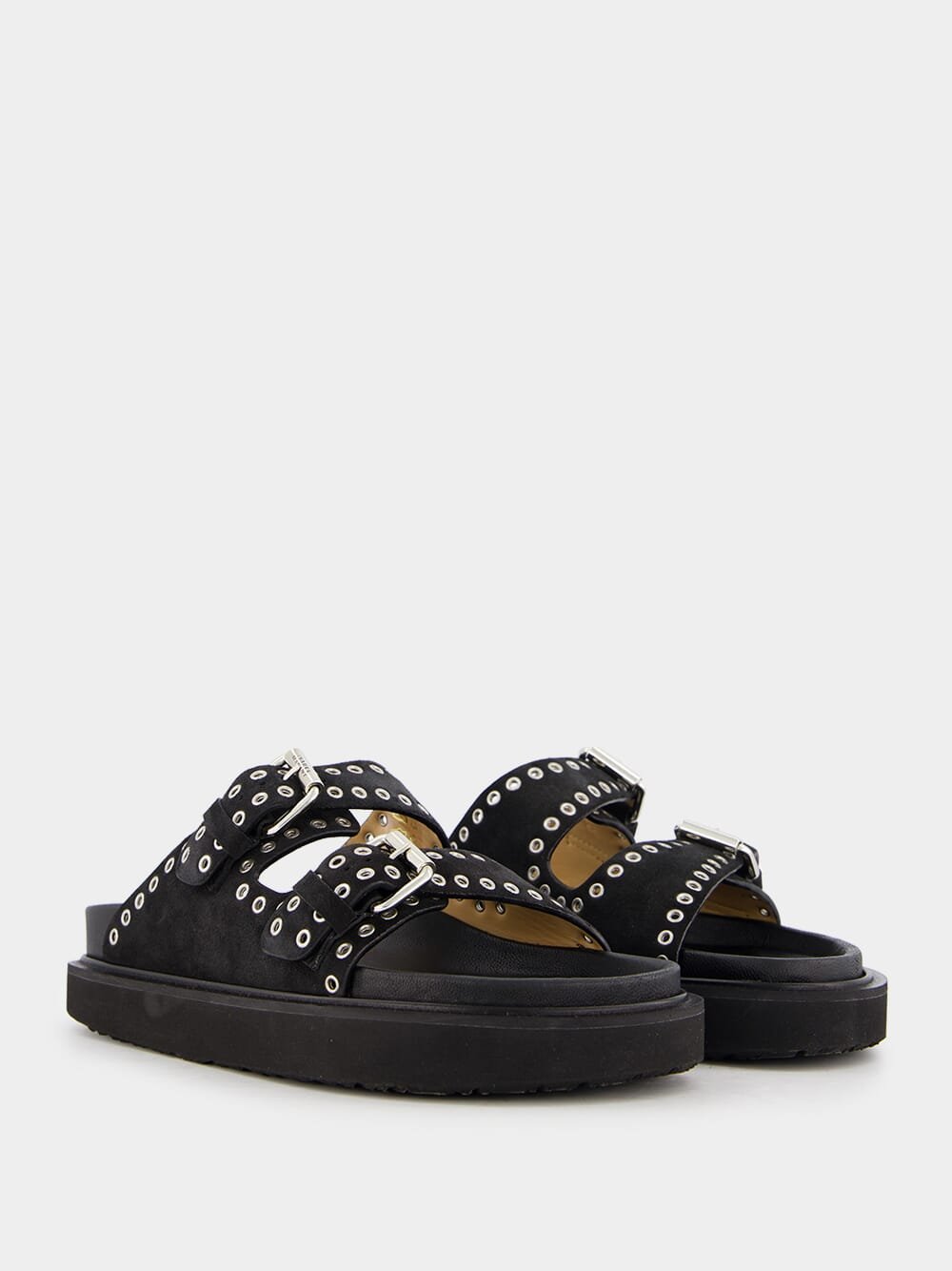 Lennyo Eyelet-Embellished Black Sandals. Crafted from premium calf leather and suede, these sandals feature a chic round open toe design. The eyelet embellishments and branded insole add a touch of contemporary flair, while the comfortable flatform sole with a durable rubber sole ensures all-day comfort. Effortlessly slip into style with the convenient slip-on design and secure your fit with the two buckle-strap fastenings.