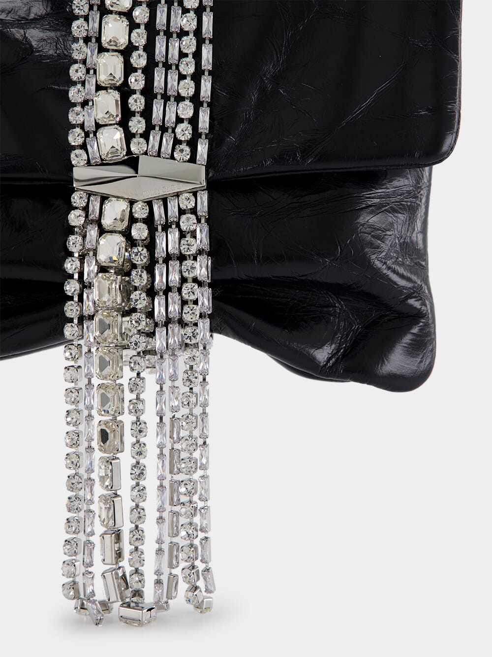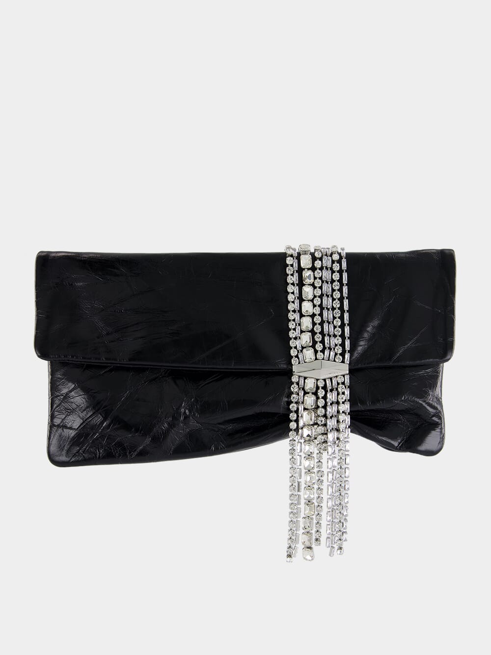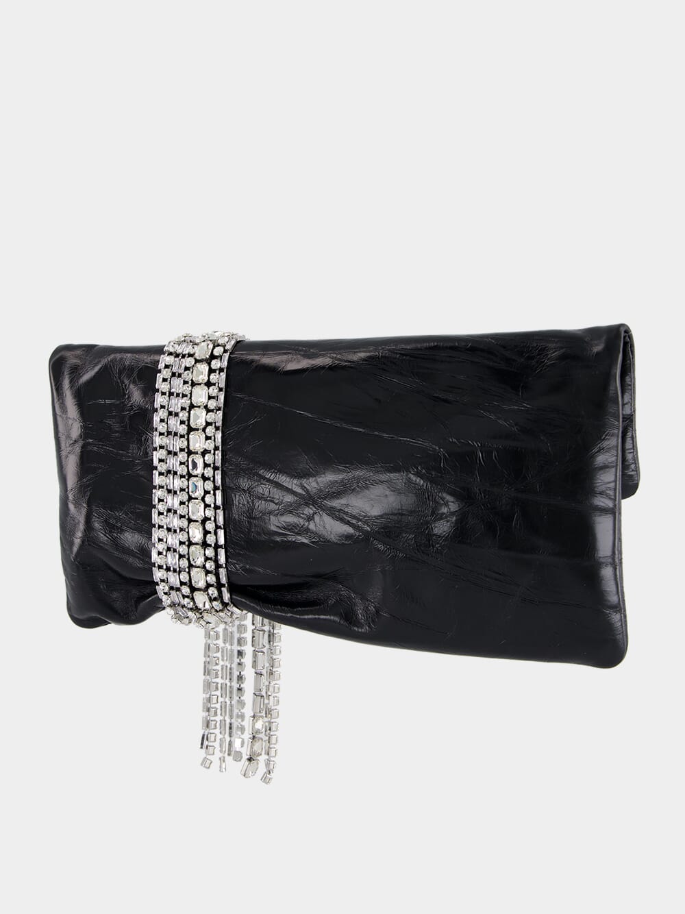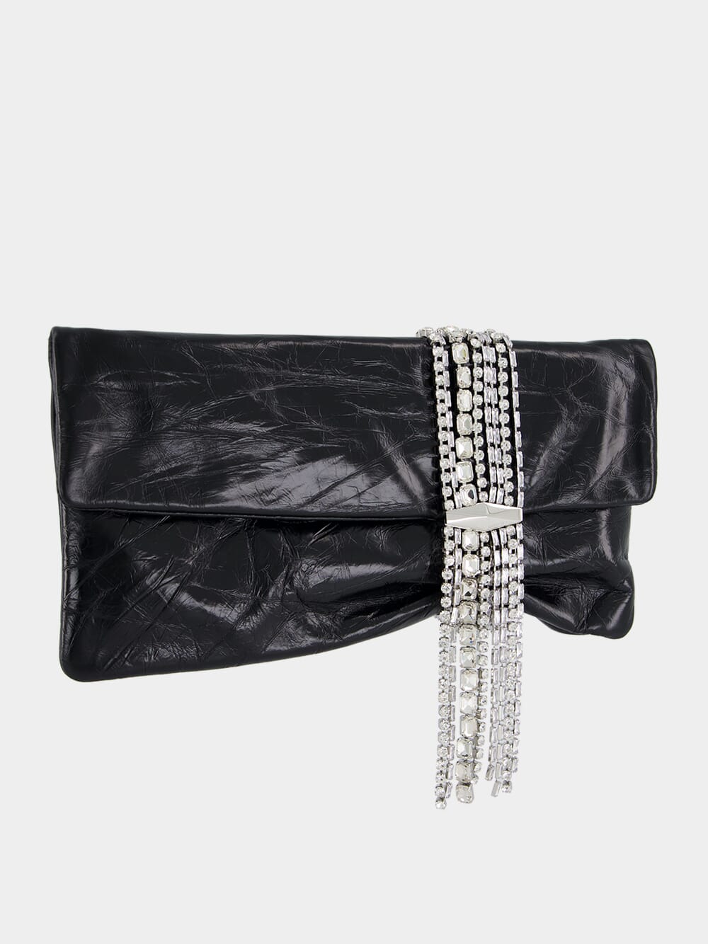 The Zandra Black Vintage Metallic Leather Clutch Bag is a striking fusion of opulence and modern elegance. Crafted from vintage metallic leather in a timeless black and silver hue, this clutch is wrapped in a dazzling crystal chandelier bracelet, creating a unique and soft silhouette. The statement style is further elevated by the signature Diamond hardware, adding a touch of luxury. Ideal for any evening occasion, the Zandra clutch offers both sophistication and bold beauty. Made in Italy, this clutch is the perfect embodiment of craftsmanship and glamour, sure to stand out in any collection.