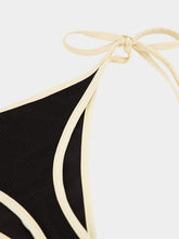 The Black and Ecru Spiritual Retreat Bikini Bottom is crafted in crinkled Lycra and framed by a bold contrast trim for modern elegance. Designed with adjustable tie sides and finished with refined tassel details, it offers a customizable fit and timeless silhouette. Pair with the matching top for a chic and cohesive beach or poolside ensemble.