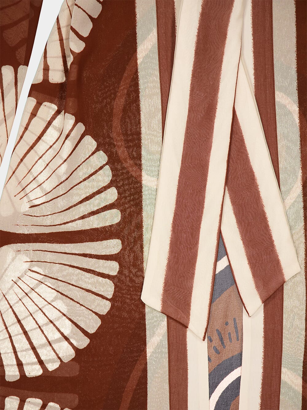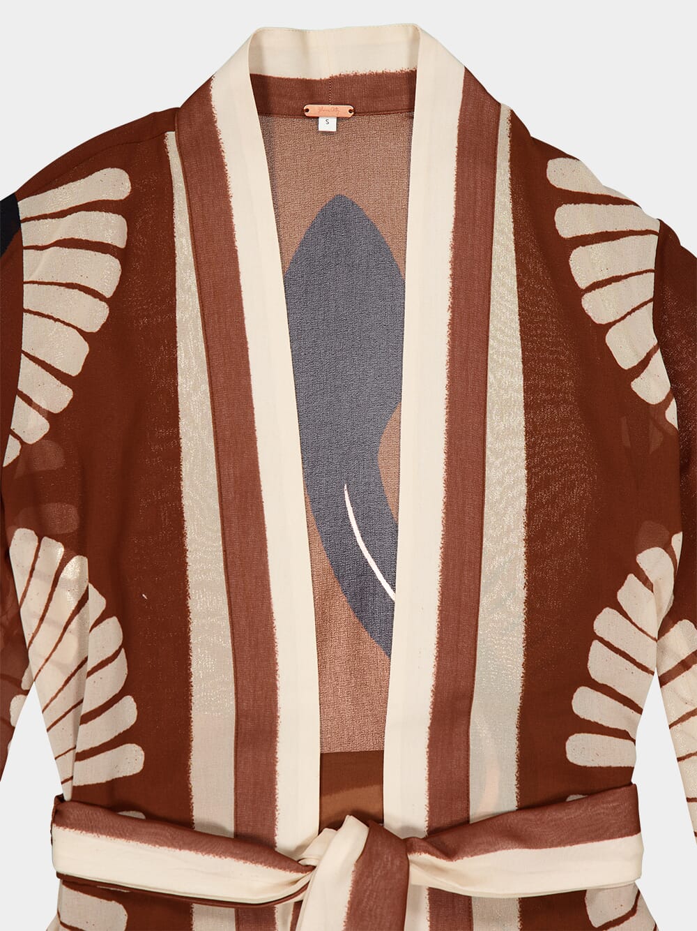 Feel the summer vibes with this kimono, boasting a mother boa-inspired print. Its sash detail provides versatile styling options, perfect for lounging by the pool or embarking on new adventures. Layer it over a swimsuit with woven sandals for an effortlessly chic beach ensemble.
