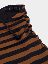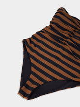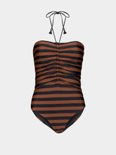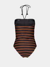 Elevate your summer style with this eye-catching printed one-piece swimsuit featuring bold stripes in brown and black. The halter neck not only provides a secure fit but also adds a touch of sophistication, gracefully framing your neckline with timeless charm. The swimsuit is accented with embroidered tassels and features a slip-on closure.
